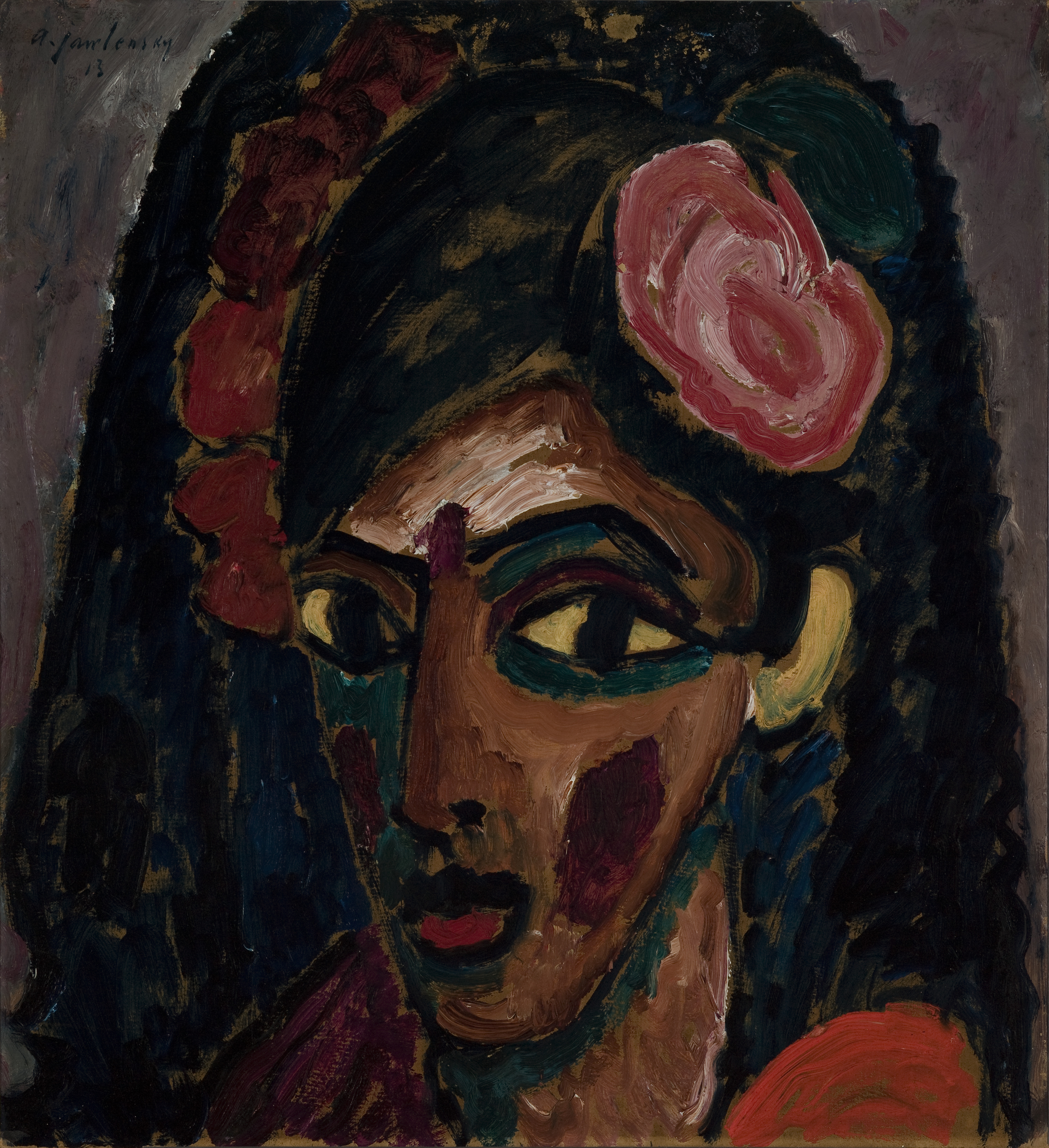 Alexei Jawlensky embellished this painting of a woman’s face with a gold earring, a pink flower, and dark veil in her hair. These details had exotic associations for early-20th-century Northern Europeans. A touch of white on the forehead and contrasting patches of burgundy and green suggest highlights and shadows. Around 1913, Jawlensky made many such paintings of abstracted human faces, characterized by loose brushwork, simplified shapes, and a non-naturalistic color palette. These were not portraits of specific individuals, but generalized types.