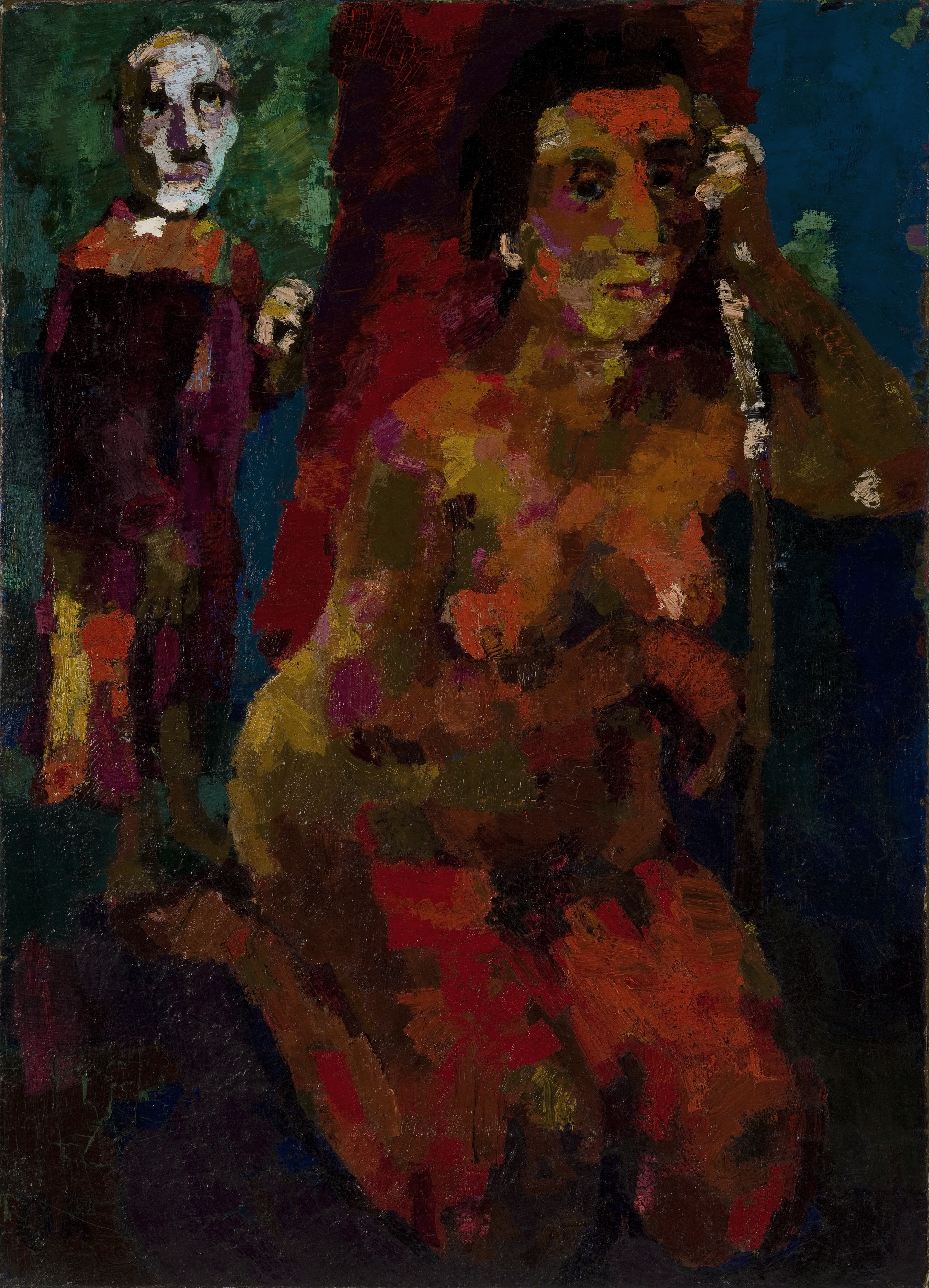 A voluminous nude is rendered here in intense color patches of red, mauve, and yellow, suggestive of stained glass. Behind her in the upper left of the composition is the artist, Oskar Kokoschka, in the act of painting. The features of the female model are those of Kokoschka’s partner, Anna Kallin; she holds a rope in order to maintain her pose. The title of the work suggests that the artist imagined his model as part of a harem.