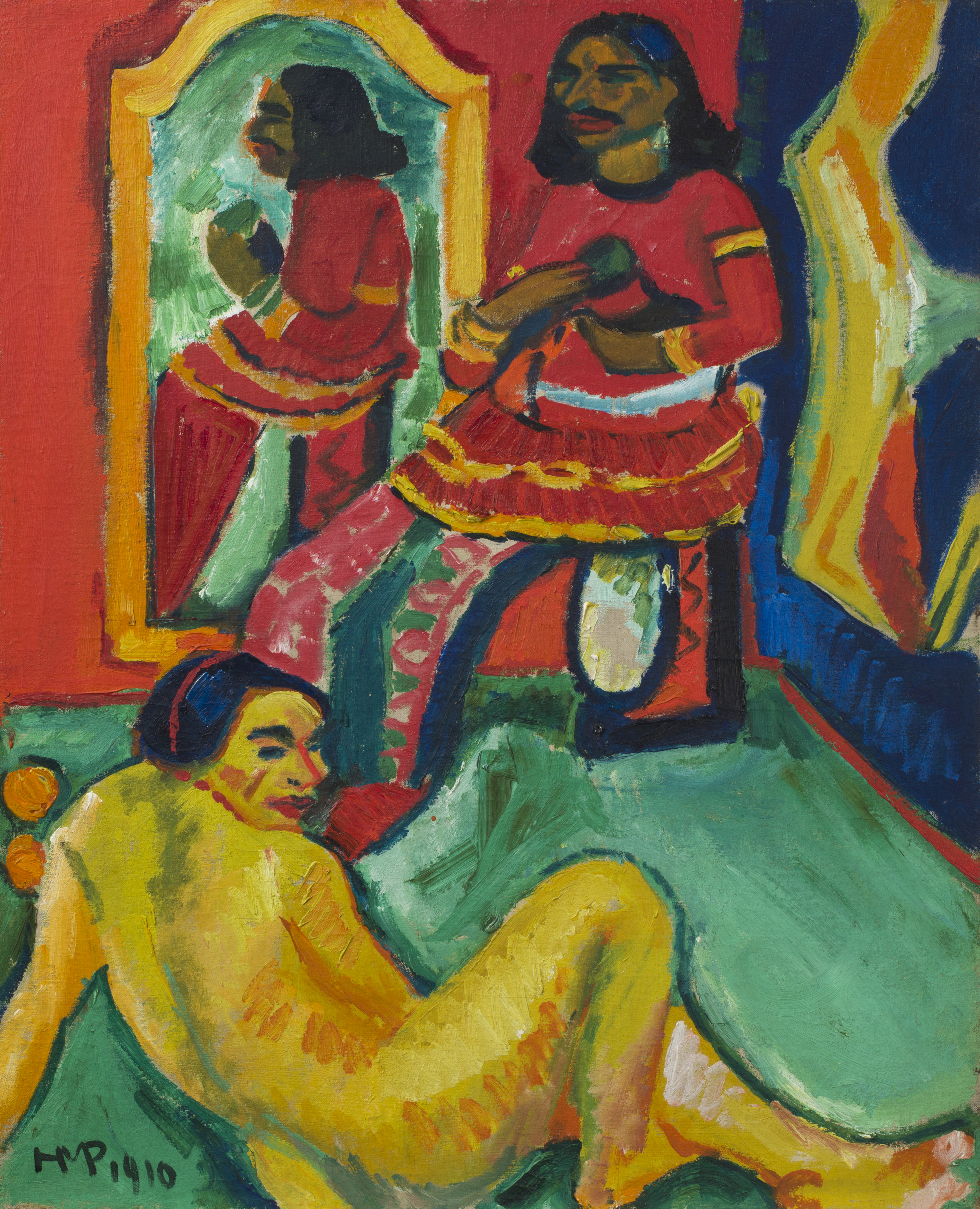 In this work, the sinuous lines of a reclining nude contrast with the vertical forms of the seated Indian and the mirror that reflects his profile. The intense colors of Max Pechstein’s palette—reds juxtaposed with greens and yellows with violets—reflect the influence of Matisse, whose work the German artist had seen on a trip to Paris in 1908. Pechstein was fascinated with Eastern culture, and this work can be seen as an imagined vision of a harem.