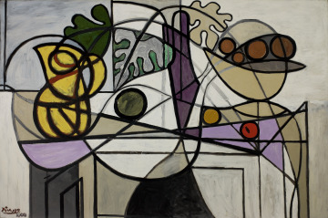 A pitcher, a philodendron plant, and a basket of fruit rest on a mantelpiece and are bound together by sweeping black lines. Pablo Picasso often invested his still lifes with secret meanings, and this work is a disguised portrait of his young and voluptuous lover, Marie-Thérèse Walter. The pitcher is painted in the brilliant yellow often used to represent Marie-Thérèse’s hair while the green apple suggests the form of her breast and the curling black lines refer to the contours of her body.