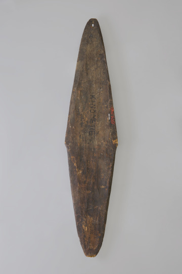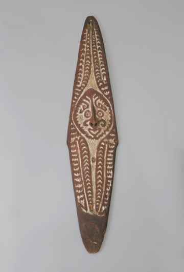 This abstracted figure, carved in relief and painted on an ovoid board, is just one example of the immense visual variety demonstrated by "gope" (spirit boards) from the Papuan Gulf. While their differences correspond to the specific spirit represented and reveal a range of regional styles, certain elements are always present. The navel, for example, emphasizes the site of transmission and origin of life. Each figure represents a particular forest or river spirit as it appeared in a sculptor’s dream. Each gope belongs to its own clan, who install them in the ceremonial men’s house within interior alcoves that display the most sacred clan objects.