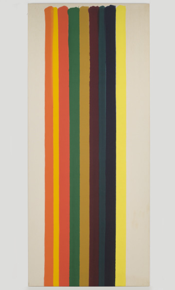 Nine adjacent stripes of color cascade down this long, slender canvas. Warm orange and yellow strips overlap with cool hues of blue, green, and black without losing their intensity. Morris Louis made this work by pouring thinned but richly colorful paint from the top of an unprimed canvas with a careful, controlled motion. Daubing the stripes at the visible top edge to give a clean, rounded finish, Louis allowed excess paint to run off the bottom of the canvas. In his “stripe paintings,” such as this one, the side-by-side placement of contrasting colors generates optical effects, making the bands of color appear to vibrate and move.