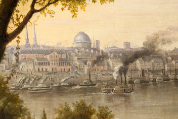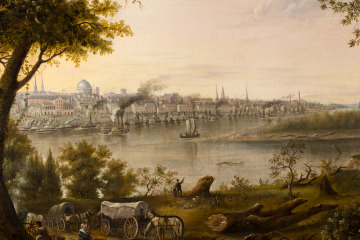 Henry Lewis came to St. Louis in 1836 to create scenery for the St. Louis Theatre. During his stay, he made several trips to document scenes along the Mississippi River. In 1846, Lewis likely sent this painting to New York City for exhibition. He wrote, “This view is taken from the Illinois shore, and you may rely on it being a correct one of our City as I took great pains in making the sketches and also took advantage of the Daguerreotype [an early form of photography]. . . although this city now contains a population of near forty thousand souls still the opposite shore remains in all its natural wildness.”
