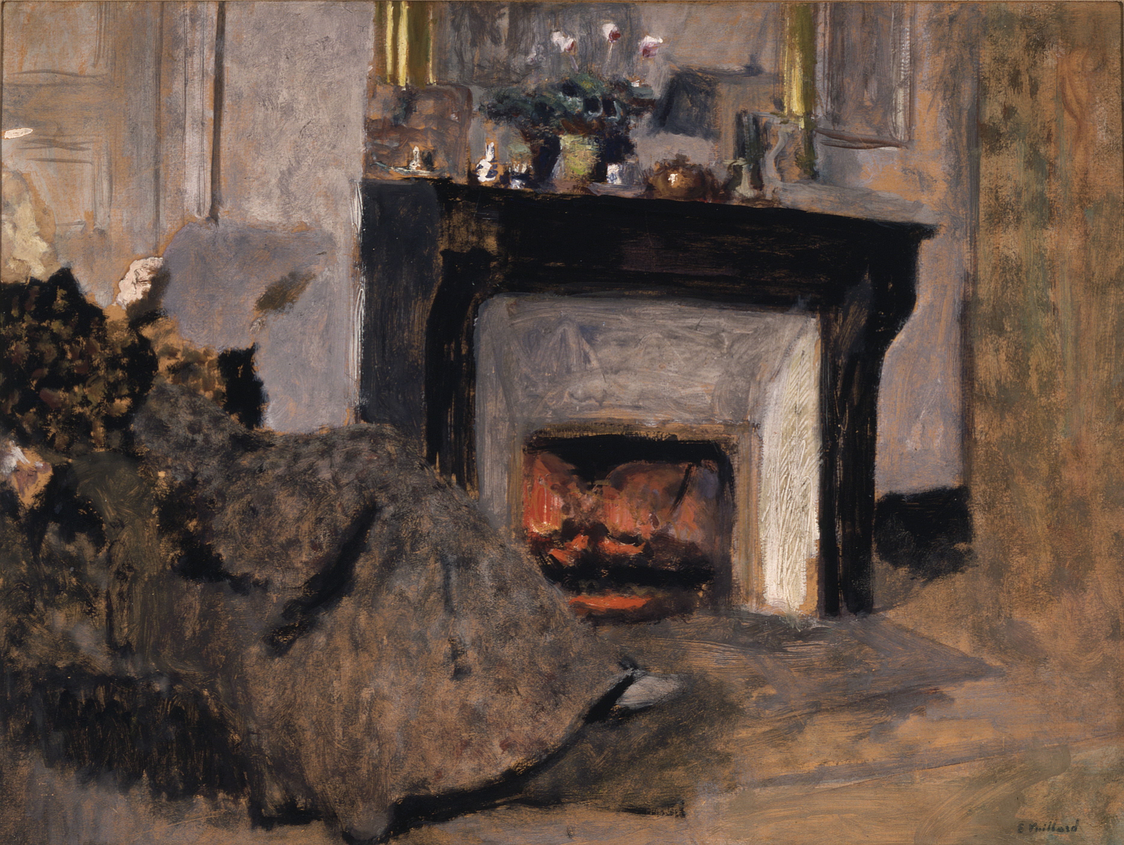 Edouard Vuillard was a prominent member of the 1890s avant-garde group The Nabis, (a Hebrew word meaning “prophet”), who acquired notoriety for their highly decorative, semi-abstract compositions. Vuillard favored representations of bourgeois interiors, often of his family home. Here he represents his mother seated in her armchair in the left foreground with her legs stretched toward the heat emanating from the fire.