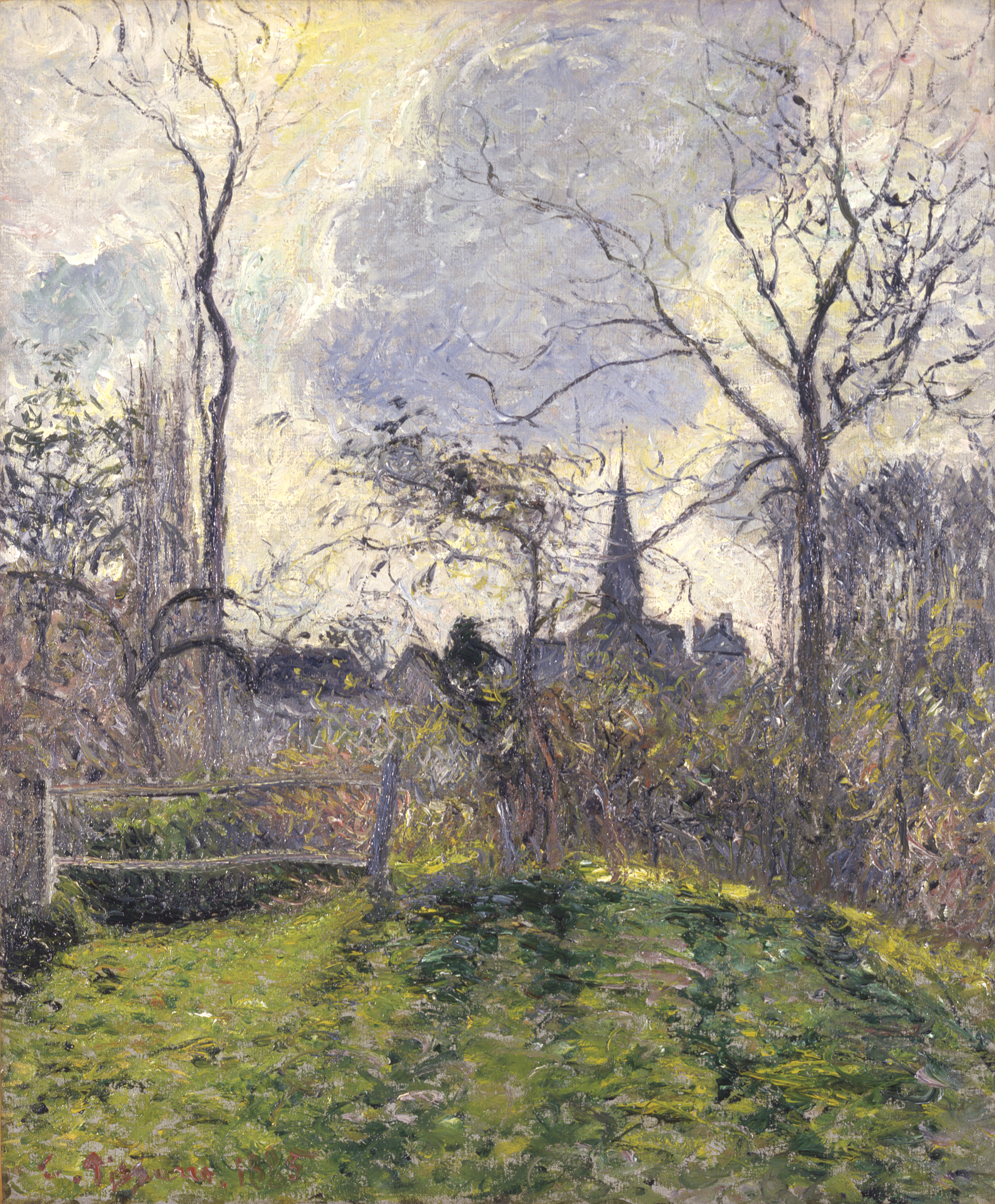 A luminous sky backlights this scene, silhouetting the village church and casting a pattern of dramatic shadows in the foreground. Camille Pissarro produced 40 views of the picturesque village of Bazincourt, some 50 miles to the northwest of Paris, and close by Eragny where he lived for the last two decades of his life. The artist signed his work in red at bottom left to stand out against the complementary color of the surrounding greens.