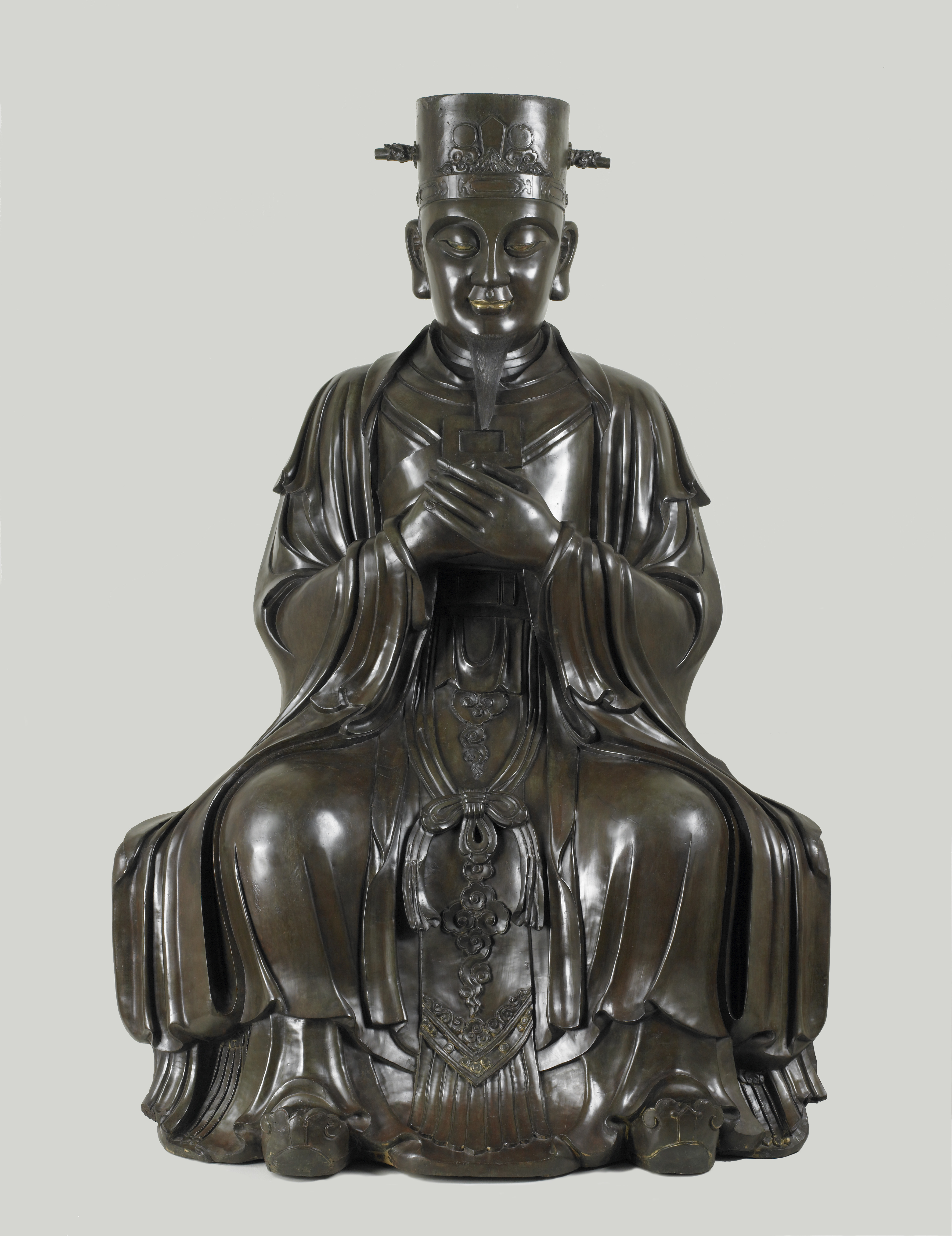 But despite its great weight of over 2,000 pounds and its overwrought scale, this sculpture is finely proportioned and beautifully composed. Although seated in a formal manner, the figure is animated by the flow of its voluminous robes from shoulders to feet. The deity's eyes, lips, and clothing retain touches of gold.