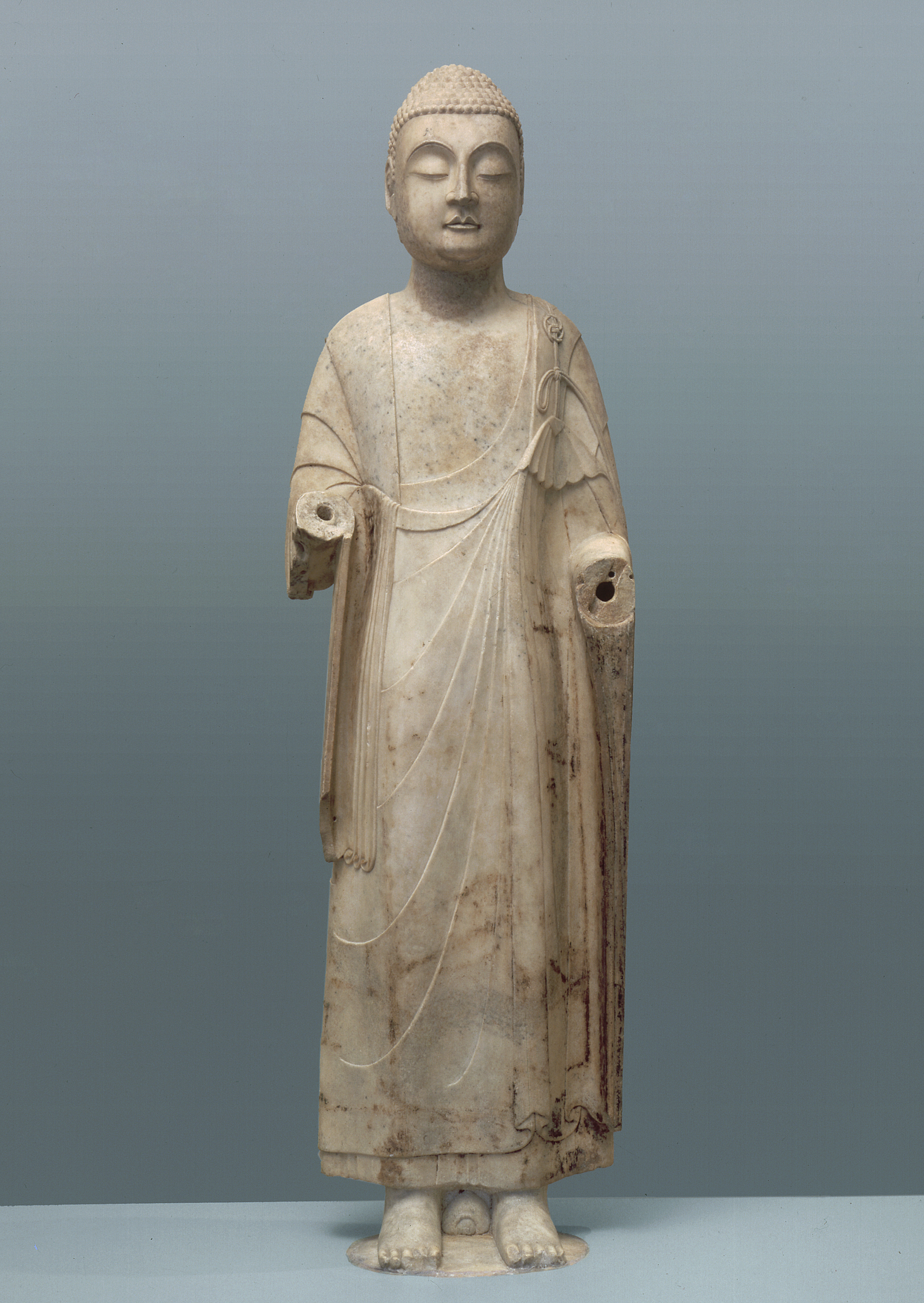 Based on stylistic analysis and other comparable works, this statue may have been made either during the final years of the Northern Qi dynasty or the early years of the Sui dynasty. This standing statue would have been supported on a lotus pedestal that surmounted a square base, carved from the same marble.