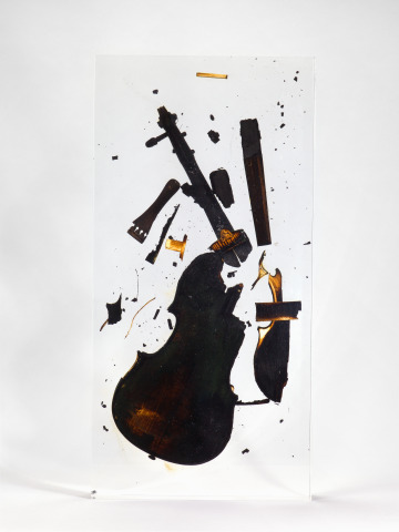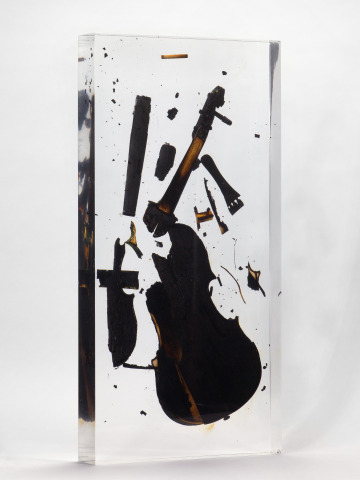 - Charred violin in plastic