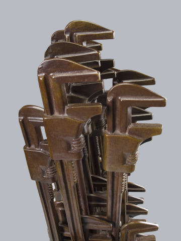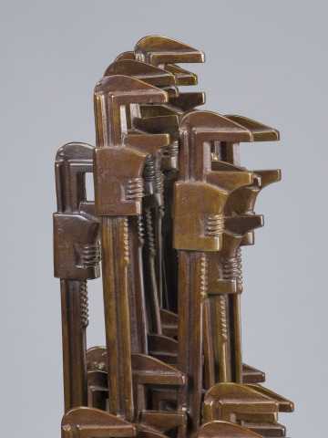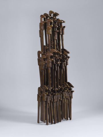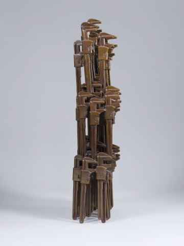 In this work Arman piled pipe wrenches cast in bronze on top of and next to one another, forming a tower of these commonplace tools. Like his fellow members of the Nouveau Réalisme (new realism) movement in postwar France, Arman explored the aesthetics of ordinary objects. Undivided Attention is one of Arman’s “accumulations,” sculptures grouping together a number of nearly identical objects. He saw these works as collections of traces left behind by consumer society, its cycles of production, consumption, and destruction. Using the traditional medium of bronze, Arman emphasized the relationship between fine art and mass-produced objects.