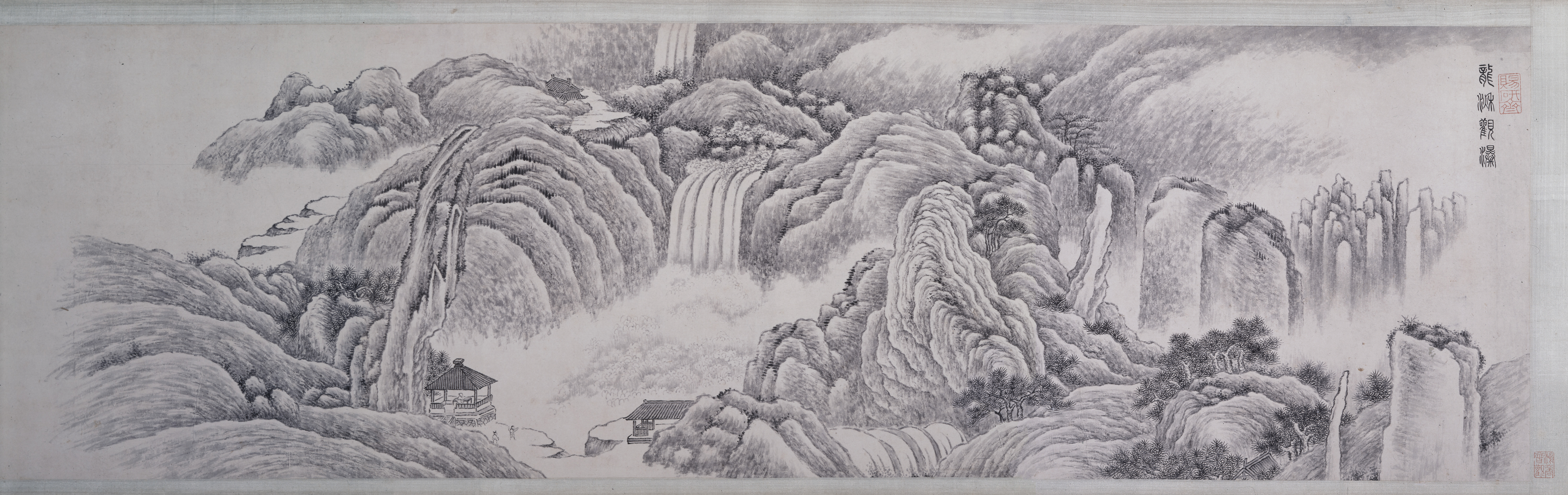 Dai Xi was commissioned by a young scholar to paint the landscape of Longqiu on Mount Yandang in eastern Zhejiang Province, a place renowned for its majestic waterfalls. The mountain was remote and nearly inaccessible, but the young scholar ventured to the distant site to admire the beautifully bizarre natural rock formations that complemented the spectacular dual falls cascading into the mountain's Dragon Pool. Dai Xi fittingly inscribed the beginning of the painting in ancient seal script, as if the title itself was carved on the very rock of the mountain. He built up layers of muted gray using an old, worn brush, gradually texturing the landscape to an extraordinary rich, silvery appearance. Dai Xi empathetically depicted his patron, the young scholar, seated alone in the poolside pavilion, serenely contemplating the clouds of fine mist rising from the roiling froth of the powerful falls.