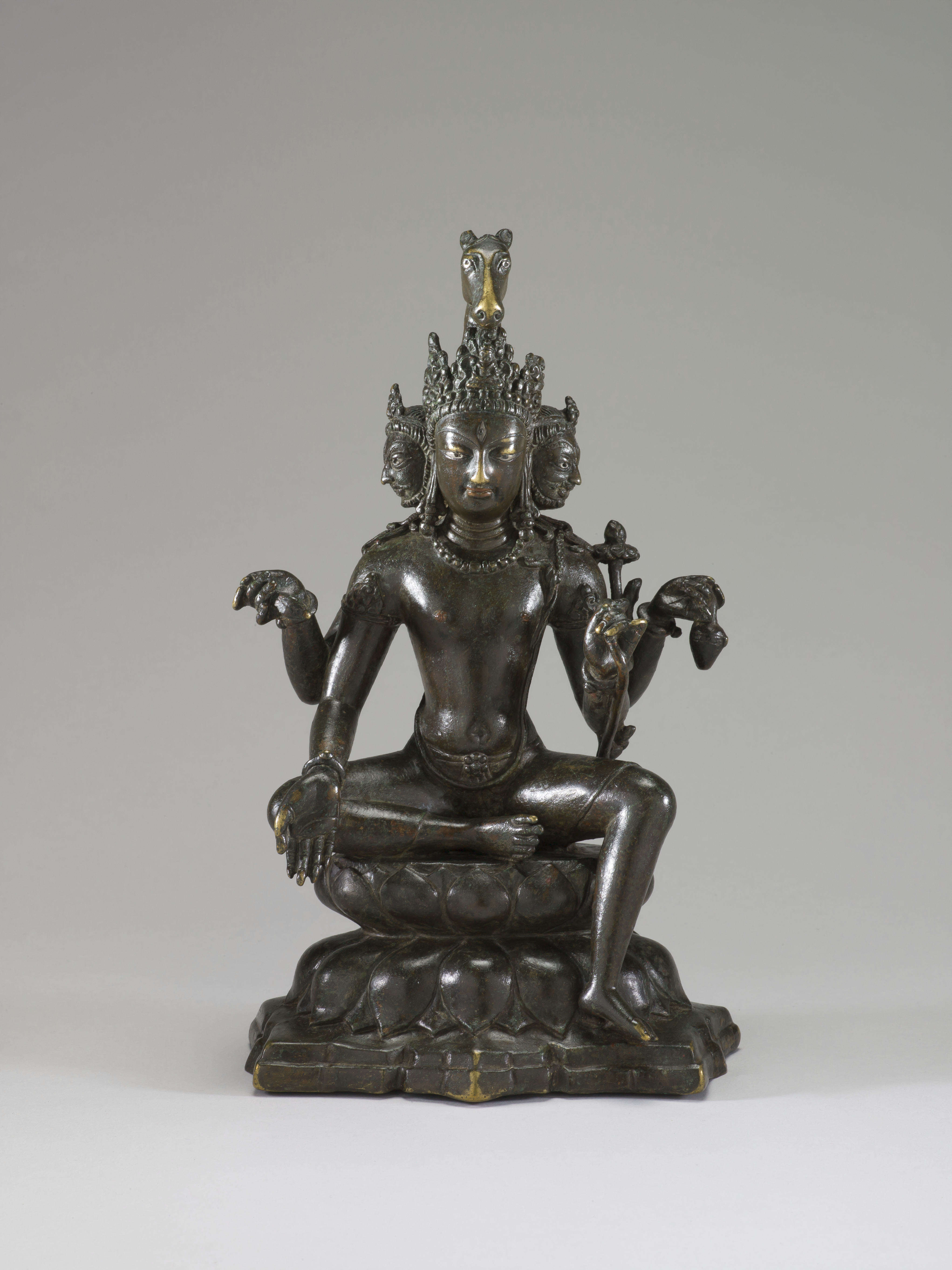 This representation of Lokesvara differs from others by including noticeably wrathful aspects, such as the two bearded flanking faces and the vajra weapon held in one hand. Uniquely, this figure also exhibits the horse’s head normally associated with Hayagriva (Horse-throated One). Here, however, “horse-throated” refers to Lokesvara’s own loud and frightening voice. A miniature figure seated on the front of the crown reveals Lokesvara as an emanation of the buddha Amitabha.