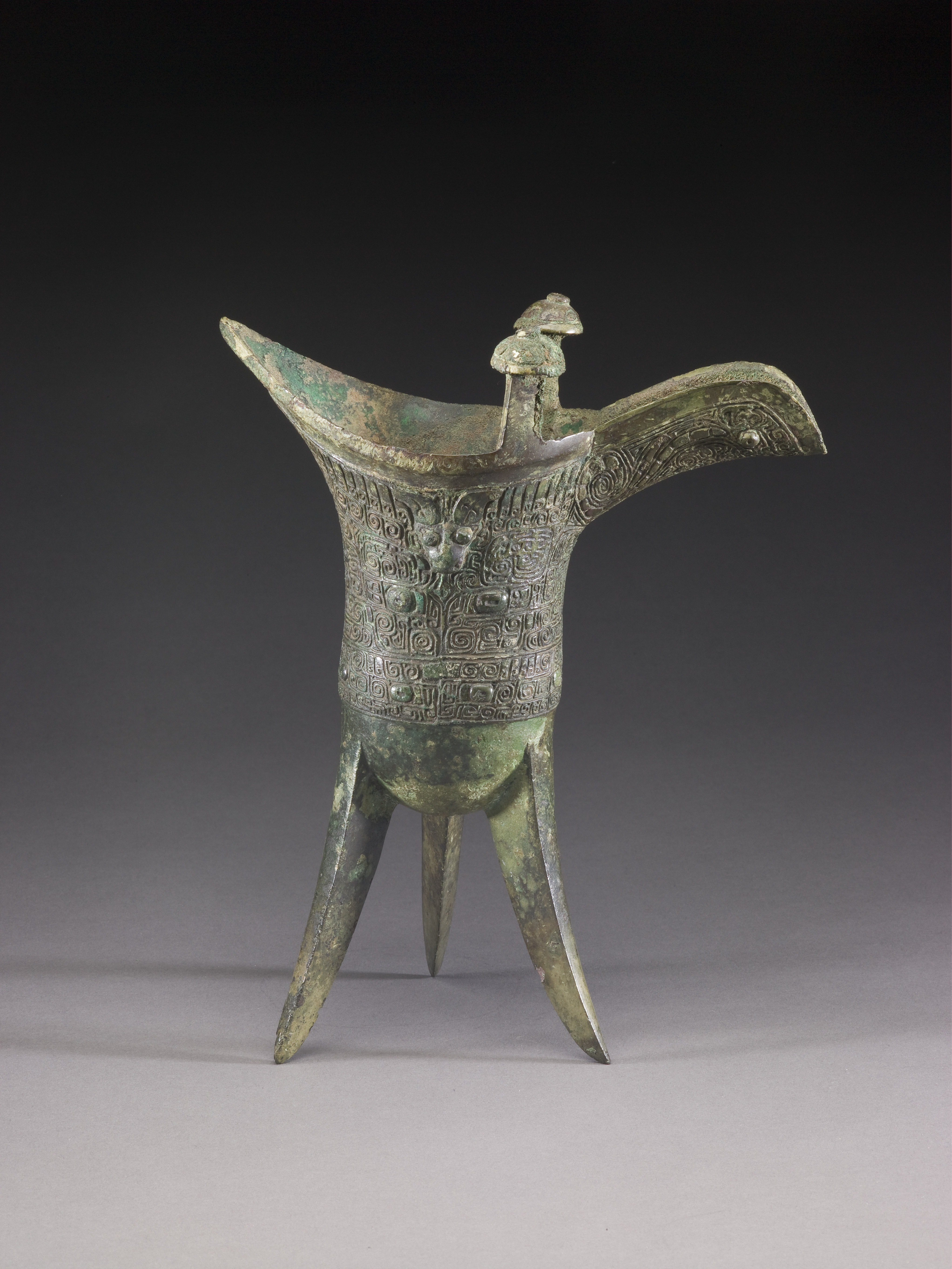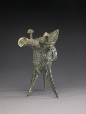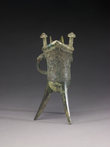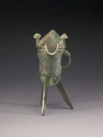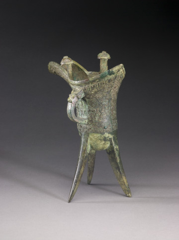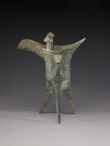 Wine Vessel (jue) with Design of Zoomorphic Masks, Spiral Patterns, and Animal-Headed Handle
