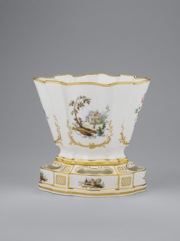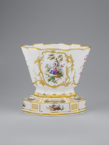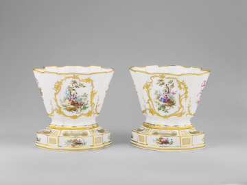 [3] "Collection A. Chevet, Porcelaines Anciennes," Hotel Drouot, Paris, November 6, 1951, lot no. 143. "143- Paire de Jardinières évantail. Décor polychrome, sur une face, de jeunes enfants dans un paysage, dans des cartouches cernés or; sur l'autre face: paysage, instruments de jardinage retenus par des rubans roses sur les cotés; sur la base instruments de jardinage et quadrillé or. Décor par Vieillard. Haut. 190mm. Voir la reproduction, planche IV. [handwritten in margin 320.000 F(?)]