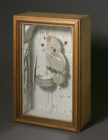 Joseph Cornell's sculptures are like 3-D collages: he affixed photographs, newspaper clippings, and other memorabilia onto and inside shallow boxes. This sculpture contains a cockatoo, a familiar character in Cornell's work, but here it is unusual for its violent imagery. The mounted cut-out of the bird rests on a perch behind a shattered pane of glass; blood-red pigment is spattered on the white wall behind it.