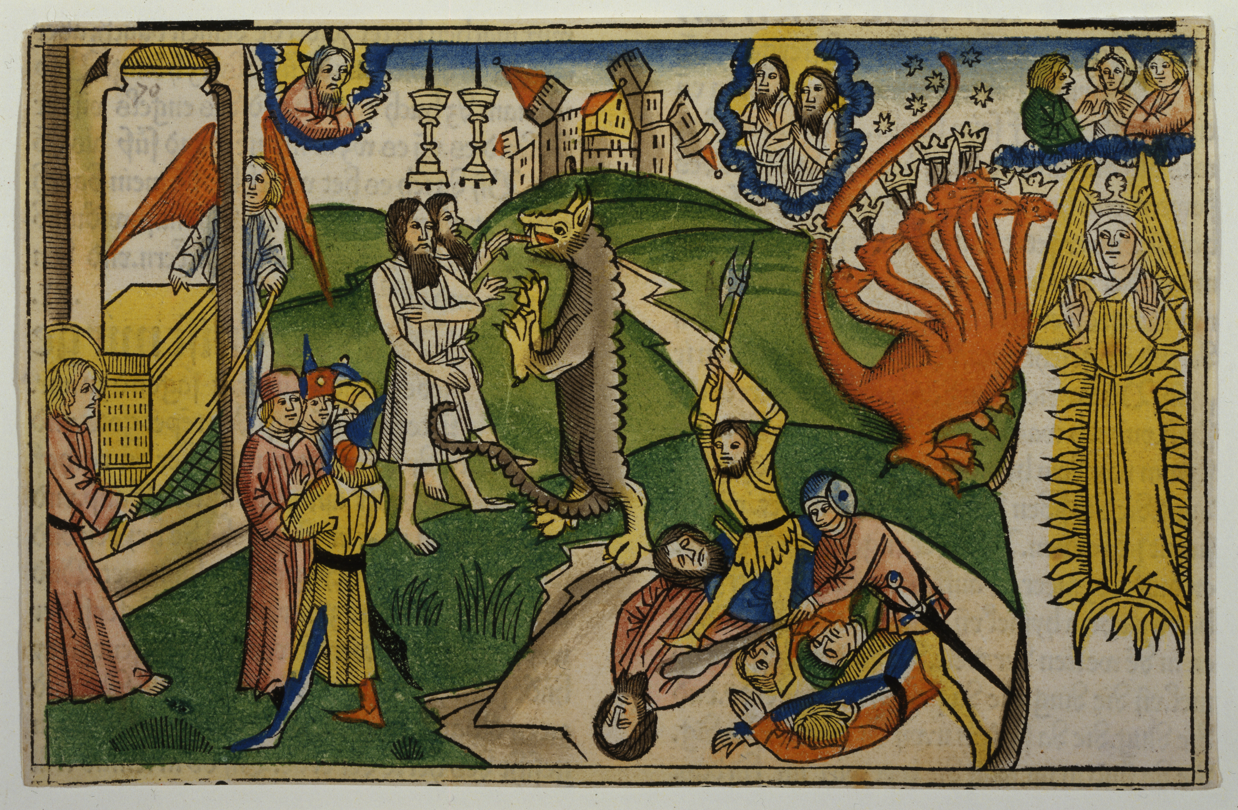 Illustration from the Apocalypse: The temple and two witnesses; the beast and the witnesses; the woman and the great red dragon