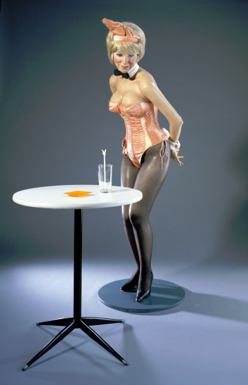 Duane Hanson cast this sculpture from a live model to achieve an unsettling and realistic effect. Hanson often depicted working Americans and here chose the Playboy Bunny as his subject. The woman wears a nametag on her hip, but she is most prominently identified by the well-known markers of the waitresses who serve at Playboy Clubs: the iconic silk bunny ears, dainty bow tie, and bustier. This lifelike depiction of a Playboy Bunny reveals how a woman’s body can be treated as an object and commodity in society.