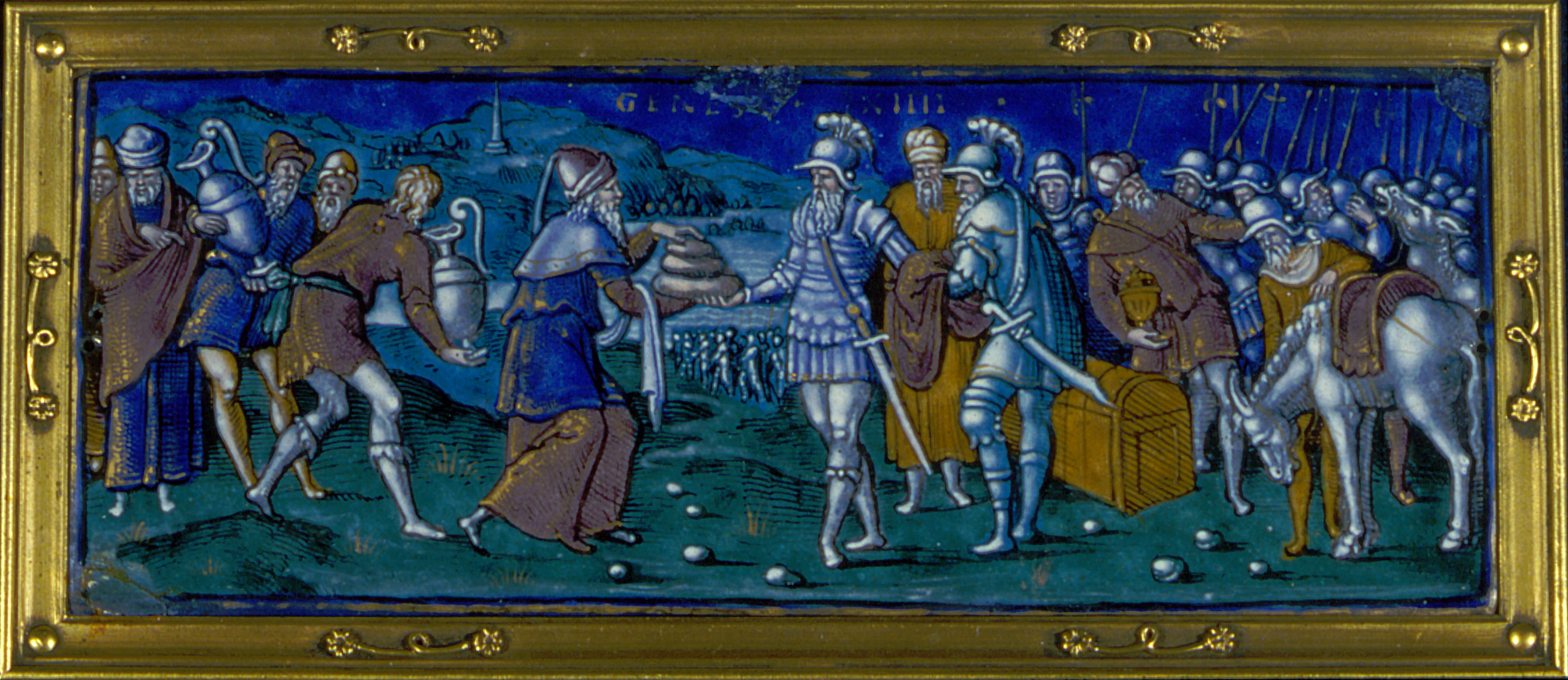 Originally part of a box, this plaque features Abram (Abraham’s name before his covenant with God) and King Melchizedek. According to Genesis chapter 14 (identified along the central upper edge of the plaque), after enemy raids on the cities of Sodom and Gomorrah, Abram led 318 soldiers to rescue captives and recover their belongings. Here, Melchizedek offers the soldiers bread and wine upon their victorious return, an Old Testament prefiguration of the Eucharist (or Mass) presented in the New Testament.