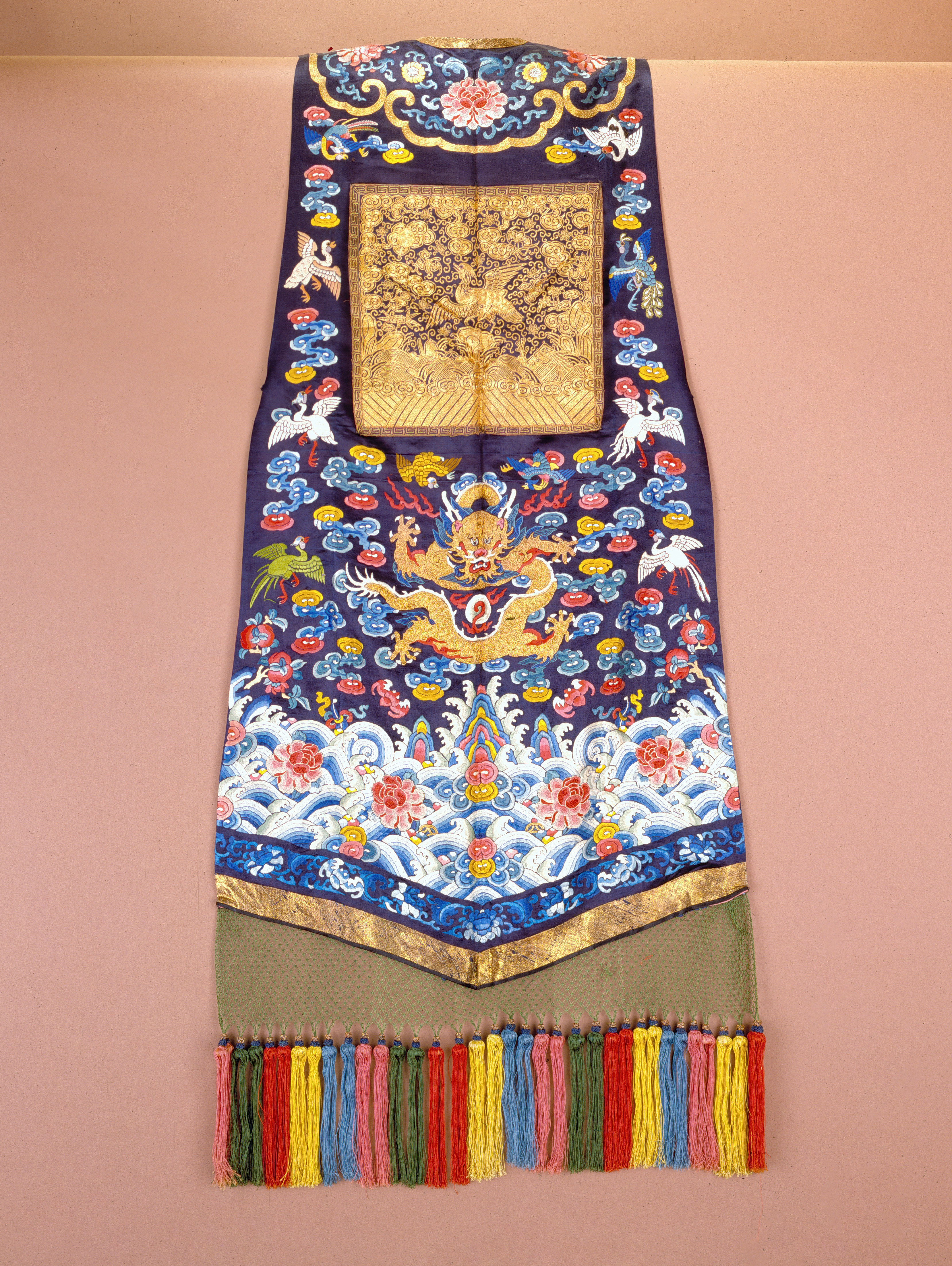 The deep blue silk satin ground of the vest is embroidered with two gold, five-clawed dragons shown in profile in front and another full-faced one at the back, all amidst multicolored clouds, mountains, the "Eight Treasures," and peonies in waves. All the peonies in the waves are embroidered in a decorative stitch style known as "Peking knot." The scattered scheme contains bats, peaches, and auspicious birds used in the rank insignia system.