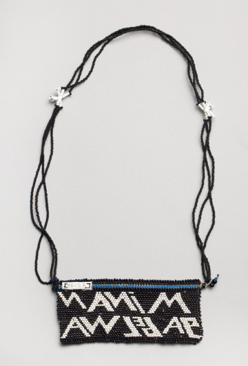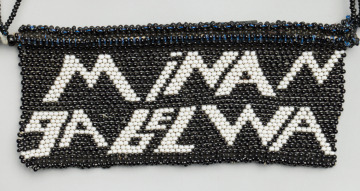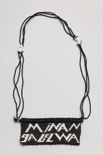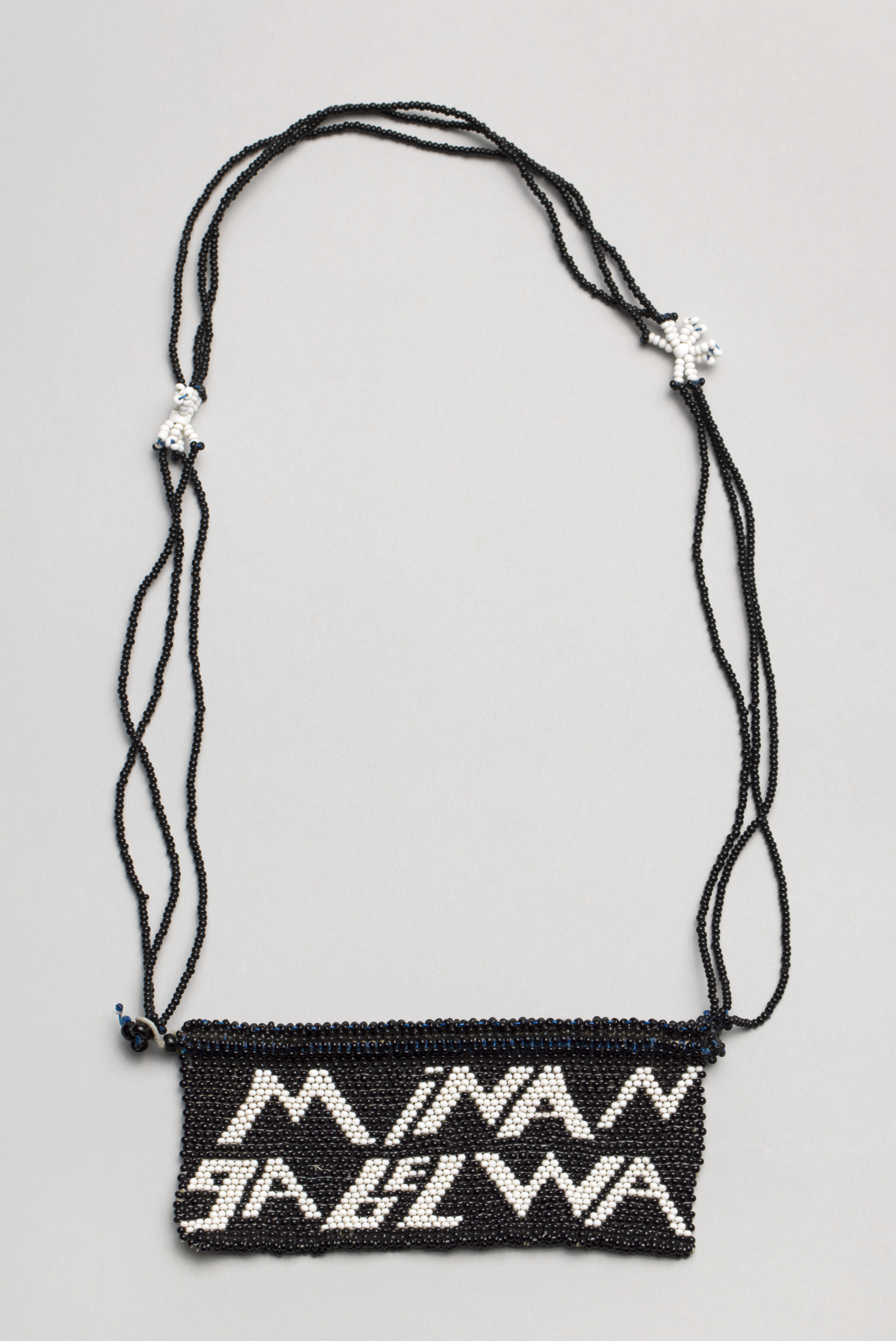 Bold, graphic text in white stands out against a black background on the pendant of this beaded necklace. The phrase “mina ngabelwa” in the Zulu language roughly translates to “I was assigned.” The individual words mina, nga, and belwa may be interpreted as “I,” “may,” and “fight,” respectively.