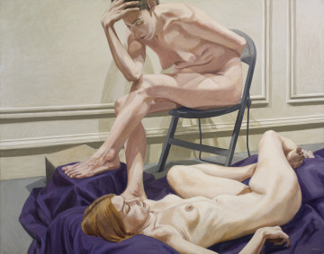 In this painting Philip Pearlstein rendered two nude models posing against a beige wall and a floor covered in purple fabric. Although the face of the seated model is bent toward the woman lying on the drape, the two do not interact. Pearlstein claimed, “I have never been interested in contact between models because that immediately suggests a story line.” Instead Pearlstein captures details of the models’ bodies as well as the textures and light effects of their surroundings in a matter-of-fact representational style.