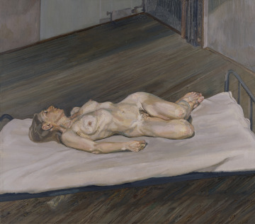 Lucian Freud presents a female form reclining on a cot in a barren interior space. The receding perspective of the composition gives the woman’s body a commanding, fleshy presence in the foreground of the painting. Using a thick buildup of paint on the canvas, Freud depicts subtle gradations of skin tone illuminated by bright light. Taking hours to record the specific physical traits of his live models, the artist also conveys his subjects’ emotional states.