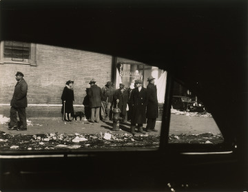This photograph is one of a series taken by Gordon Parks for a Life magazine story on gang violence in Harlem. Using the car window as a frame, Parks takes the position of an outsider looking at the Harlem neighborhood. Parks shows men and women walking on a sidewalk, though few of the figures interact. Debris on the street suggests the neglect that plagued the once vibrant neighborhood.