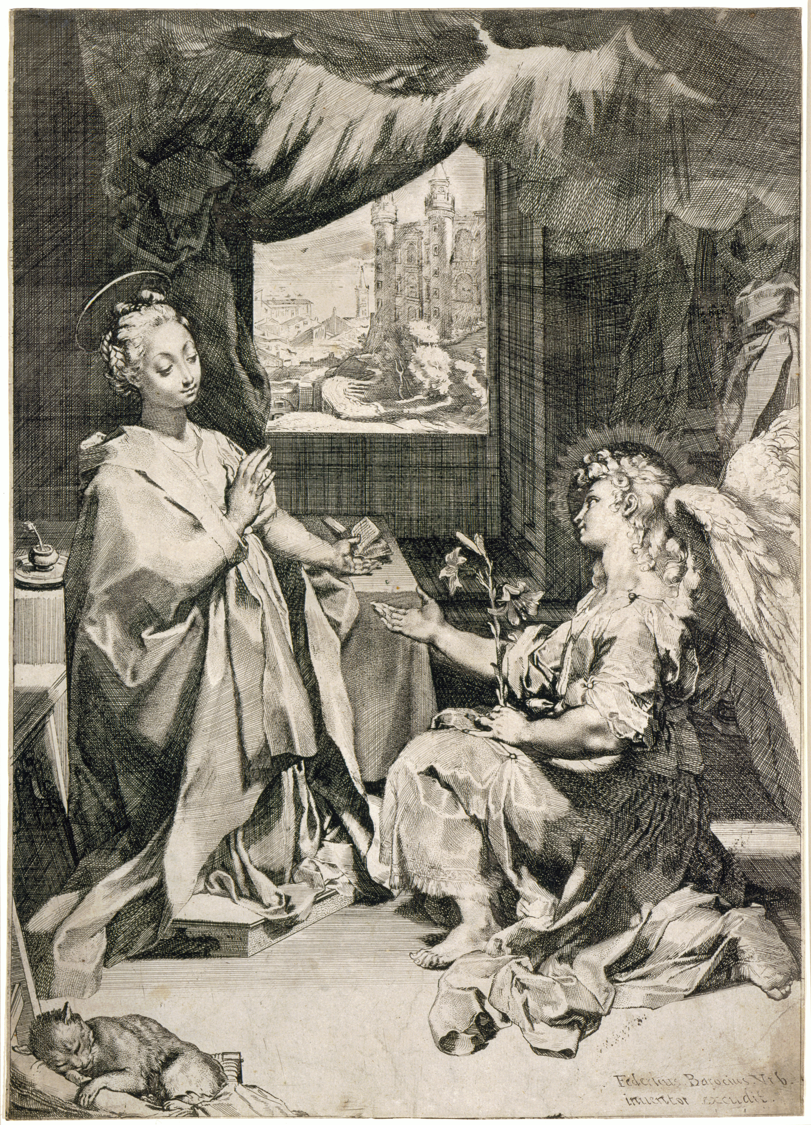A native of the city of Urbino, Federico Barocci belonged to a generation of artists who rejected artifice and embraced instead a style based on the natural world that used veils of soft color and luminous drapery. Barocci created only four etchings; among the most beautiful is The Annunciation. The variety of tone and lightness of touch that he was able to capture in the etching allowed him to translate the delicacy and transparency of the painting surfaces to the printed form. This print reproduces an altarpiece commissioned by Francesco Maria II della Rovere for the ducal chapel in the basilica in Loreto, a town along the east coast of Italy. The duke's famous palace in Urbino, built in the 15th century, is visible through the open window.