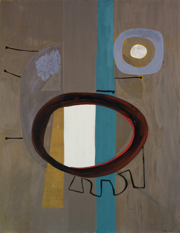 In this mixed-media work, Robert Motherwell merges painting with collage elements, like sand and wood veneer. Though not representational, the work explores the relationship between reality and abstraction through the use of commonly found objects. Motherwell wrote that this collage was "made in East Hampton, Long Island, one winter. There is some sand in it and the colors have to do with the sand and sea in winter."