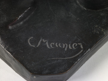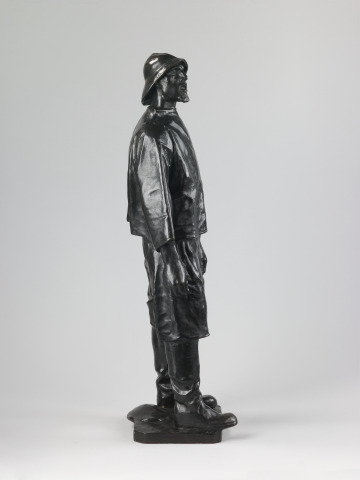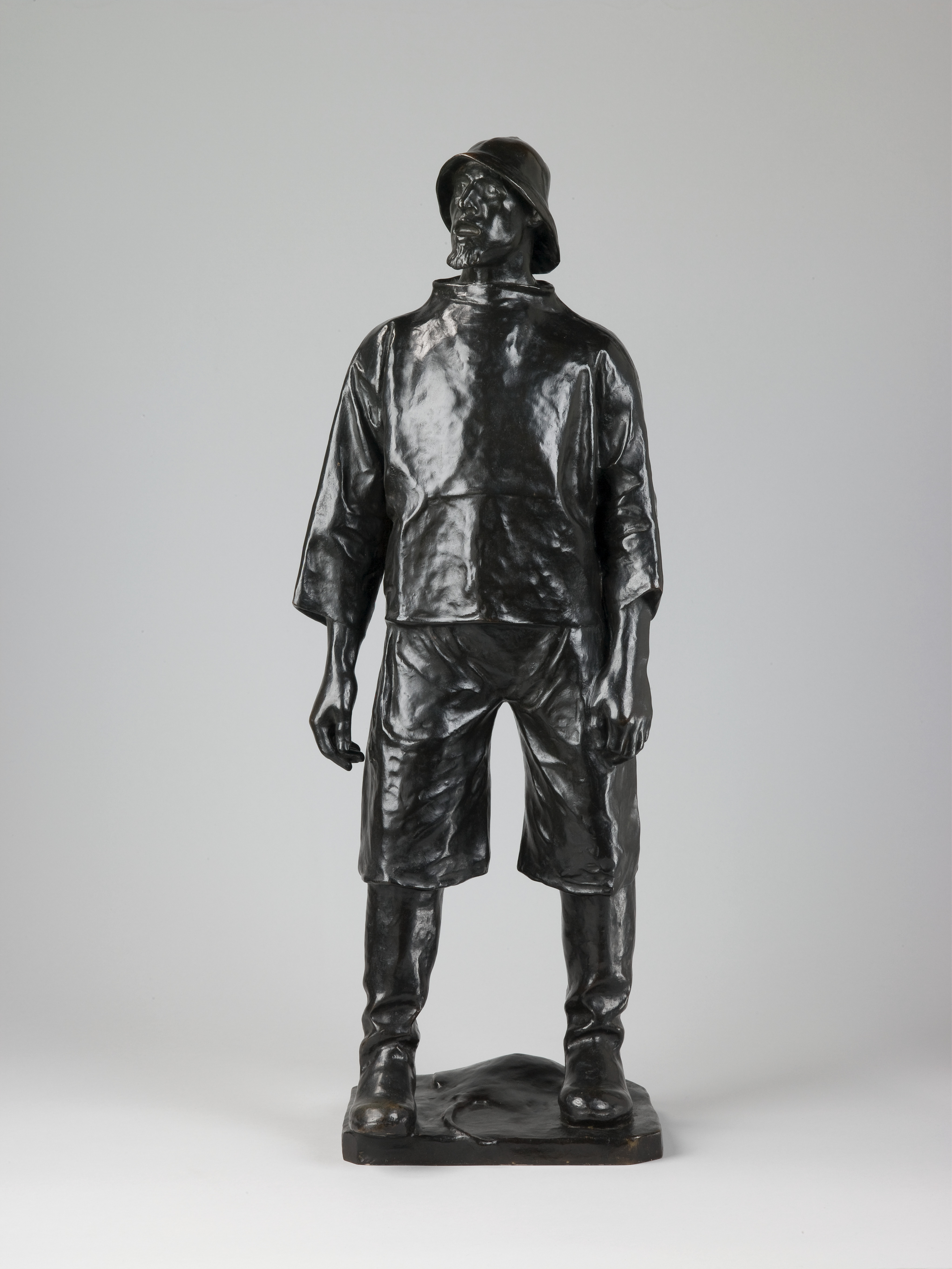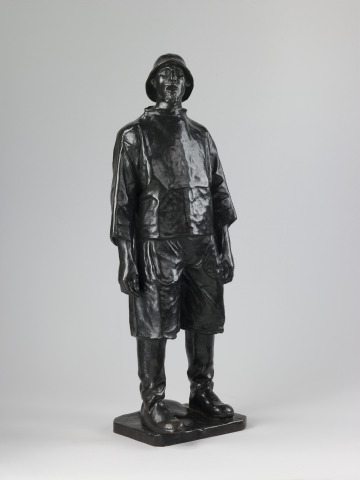 A fisherman in rubber boots, oilskin jacket, and hat opens his mouth as though shouting to a distant comrade. A marine ray at his feet suggests the nature of his profession. Constantin Meunier may have modeled this figure after laborers he observed at the wharf at Ostend, a Belgian coastal city. Meunier became well-known late in his career for sculptures of workers at docks, mines, and forges and in agriculture and domestic occupations. Despite this fisherman’s grueling employment, his upright posture and muscular physique lend dignity, even heroism, to his labor.