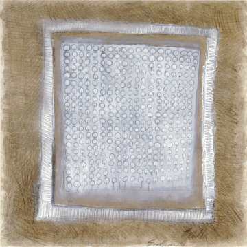In this mixed-media drawing Eva Hesse, who is known for her organic shaped sculpture, reacts to the mathematical precision and cold fabricated materials of Minimalist art by creating a slightly off-kilter grid of small hand-drawn circles. She creates texture with densely woven graphite marks and viscous passages of opaque white gouache, a water-based paint, which she scrapes into with the handle of a wooden paint brush.