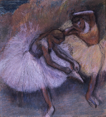 This densely rendered pastel of two ballet dancers warming up is representative of the last two decades of Edgar Degas’ career. His focus narrowed in on two of the many subjects from his Impressionist years: dancers and nudes. He continued to paint with oils on canvas, but he also created many more pastels on paper with painterly scale and ambition.