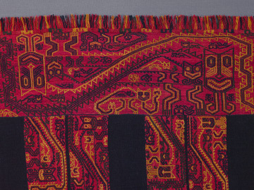 Cats abound on this enormous textile, occupying open space within and between other cats. Angular outlines of felines repeat in linear formation with remarkable consistency, but their forms are somewhat obscured by the overall geometry and rhythm. Cats best seen in the top and bottom horizontal borders express duality as two-bodied beings. Follow the serrated outline of a cat’s back to see how its tail turns a corner and becomes the tail of another cat. This mantle does not show signs of frequent wear, which suggests it was made for the exclusive use of wrapping the dead prior to burial in the coastal desert.
