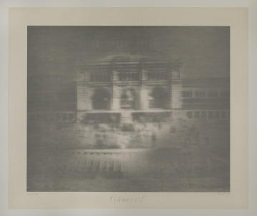 In the 1960s, Gerhard Richter began experimenting with the industrial printing techniques used in this print. Here, Richter altered a postcard image of a building to create a circle of light at the center. He then had the image printed out of register, or misaligned, resulting in a blurred effect that lends a sense of mystery and drama. By using a common illustration as a starting point, Richter intended his print to be an amusing commentary on the relationship between commercial and fine art.