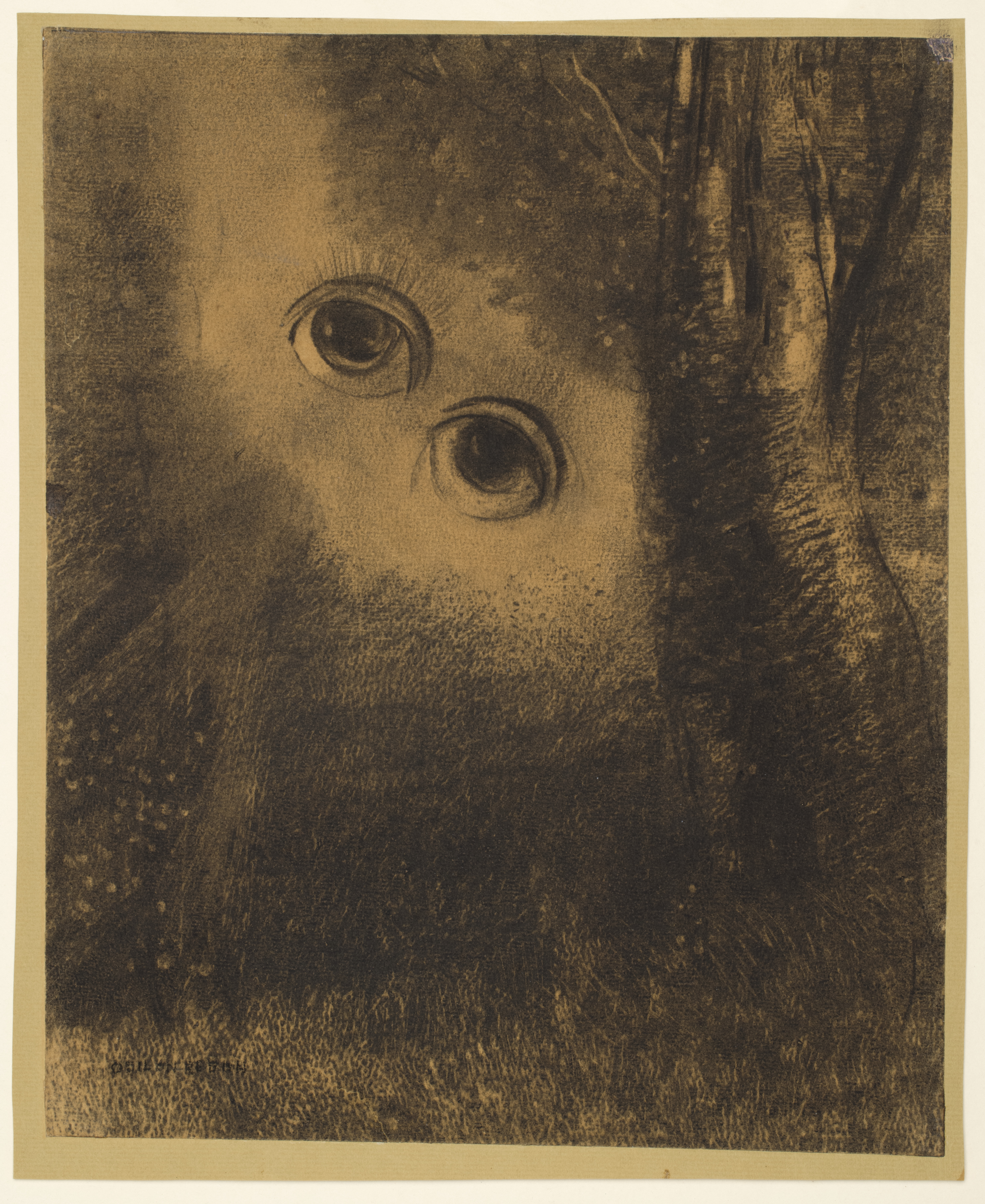 A pair of disembodied eyes float in the middle of a forest, gazing out toward something beyond the viewer’s line of sight. The naturalistic depiction of the tree on the right contrasts dramatically with the apparition of the eyeballs, which seem to emanate a glowing light that illuminates the forest clearing. With these strange contrasts, Odilon Redon transformed an otherwise familiar landscape into an uncanny realm.