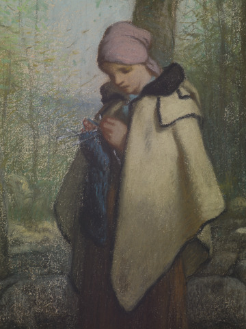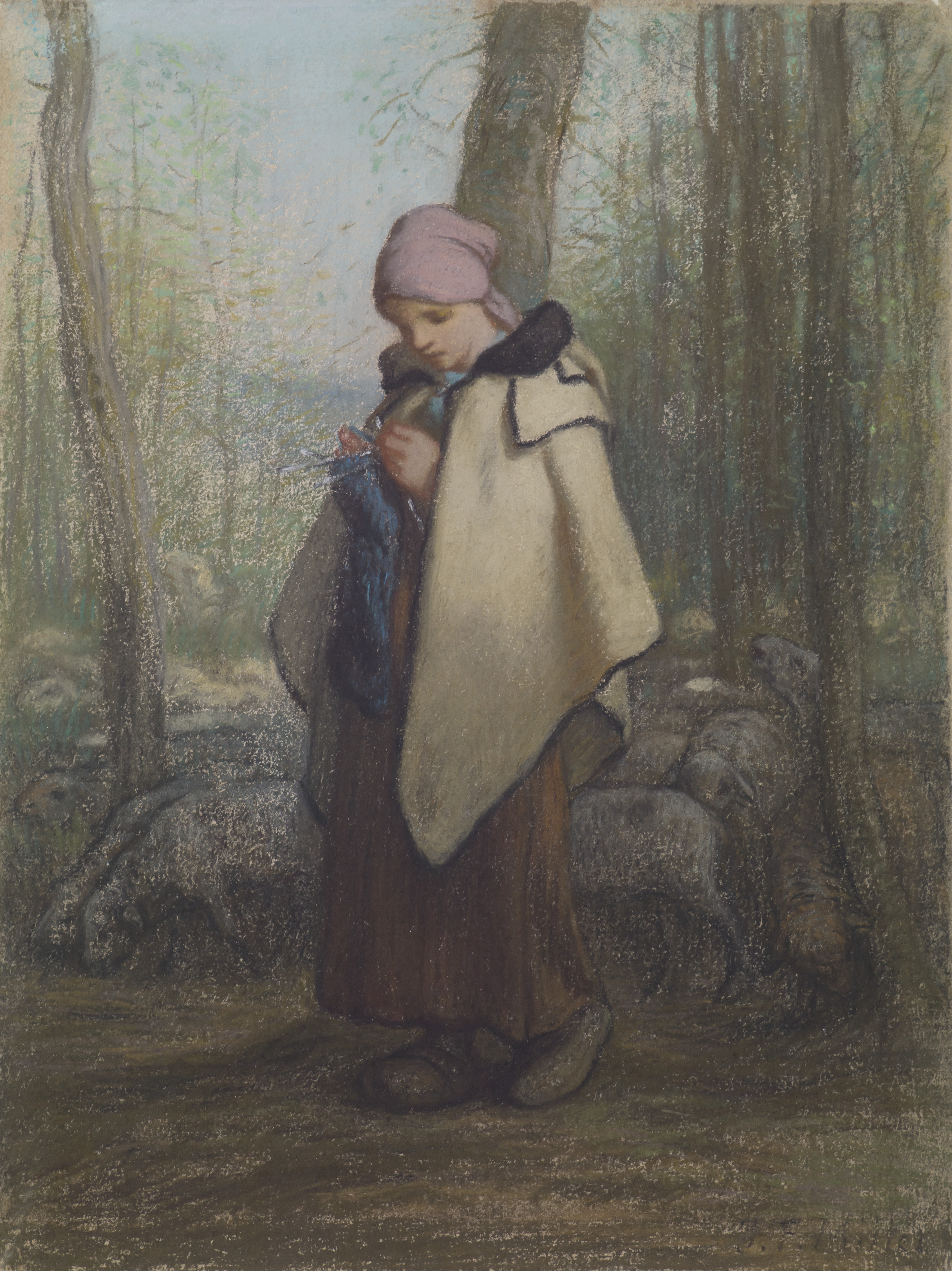 Jean-François Millet is known primarily for his sympathetic images of rural workers in the French countryside. One of his favorite subjects in the 1850s was the young shepherdess who concentrates on her knitting while her flock grazes nearby. This scene is rendered in rich pastel, lending vibrant color to her clothing and an earthy realism to the forest setting.