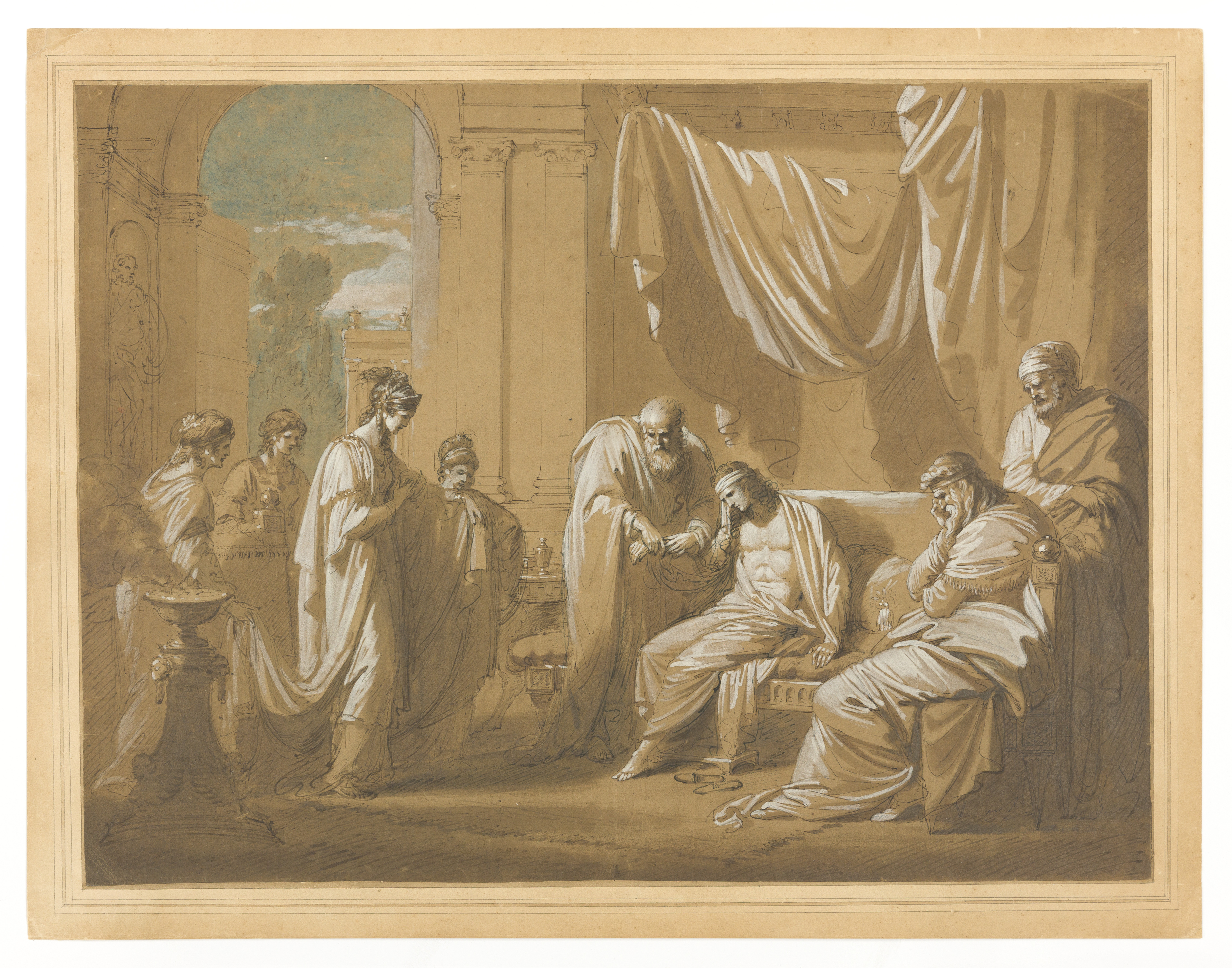 The subject of this drawing comes from a legend loosely based on ancient Greek history. The Syrian king Seleucus (seated at right) summoned a physician to diagnose a mysterious ailment afflicting his son Antiochus. The doctor concluded that the prince was suffering from unrequited love for his own stepmother, Stratonice, who stands at left.
