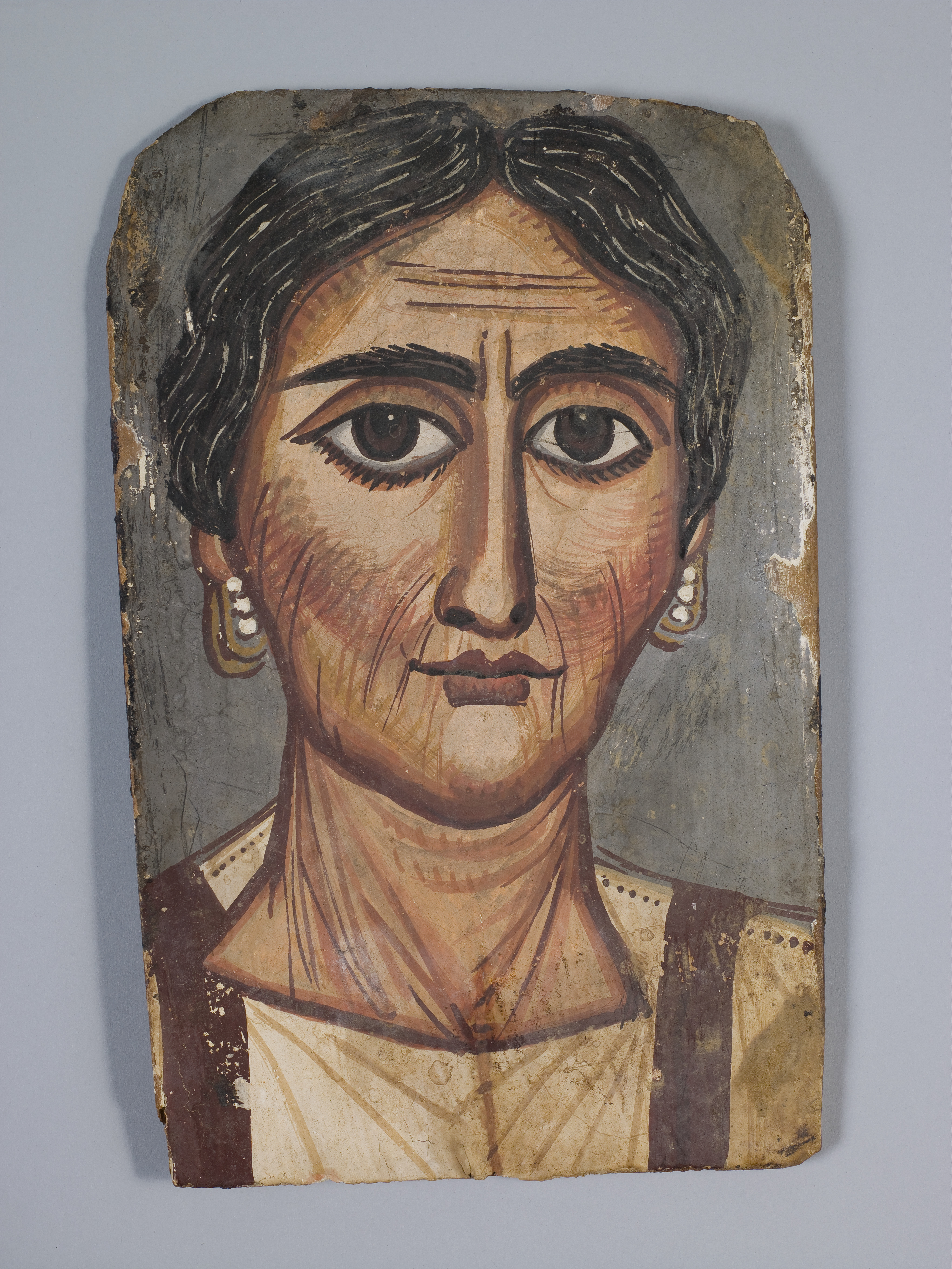 Unlike the idealized faces from earlier periods, this portrait from the Roman period in Egypt portrays the subject as she looked in real life. Her almond-shaped eyes dominate this striking likeness of a well-to-do Egyptian woman (note her gold and pearl earrings). Portraits like this were placed over the face of a mummy and held in place by the outermost wrappings. The portrait was likely commissioned while she was still alive, capturing her in middle age with gray-streaked hair and deep forehead creases.