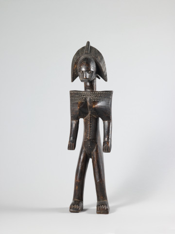 This figure represents a beautiful young Bamana woman of marriageable age. The lightly incised designs on the torso refer to the scarification patterns acquired by young women in the initiation ceremonies that prepare them for marriage. Historically among the Bamana, both girls and boys near puberty were initiated into the Jo society, an organization designed to instill the essential elements of what it means to be Bamana. The newly initiated young men toured neighboring villages for a period of several months, entertaining with songs and dances they learned during initiation. In return for the entertainment, the young men received gifts and had the opportunity to meet prospective brides and their families. By displaying figures like this one, the initiates illustrated their desire to meet eligible brides.
