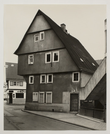 Bernd and Hilla Becher spent their careers surveying obsolete and underappreciated buildings. The subject of this image is a house uniquely designed, with an asymmetrical facade, for a corner site. It is an example of a traditional German building type, in use from the 14th century on, with stepped projections of the upper stories that allow for more space in narrow streets. The image’s muted lighting brings attention to the roof’s broad contour. The high-resolution invites viewers to examine alterations made to the house over time—mismatched windows, tar paper roofing, and gritty plasterwork on the facade that covers older underlying, half-timbered construction. The passage of time is also suggested in the surrounding structures; a concrete stairway to the right and a renovated building in the background show transformation in the area.