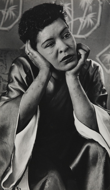 Jazz singer Billie Holiday is captured in a vulnerable moment by photographer Moneta Sleet Jr. The portrait concentrates on Holiday, wearing a glamorous satin robe, as she rests her head on her hand in apparent exhaustion. Sleet deliberately reveals Holiday’s needle marked arms, visually referencing her lifelong struggle with drug addiction. Featured in the September 1956 issue of Ebony magazine, this intimate portrait accompanied the article “Billie Holiday’s Tragic Life.”