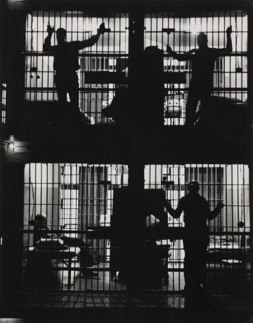 Behind prison bars, the silhouettes of four inmates are illuminated against a cell block background. This photo was the main image used for the Our World magazine article “Michigan’s Good-Time Prison” in 1953. Photographer Moneta Sleet Jr. produced an elegant and stylized photo that emphasizes the composition’s contrasting light and dark tones. While the physical separation and postures of the inmates evoke individuality, the inability to see the men’s features represents anonymity. Three of the men clutch the cell bars, creating a connection in an otherwise barren environment.
