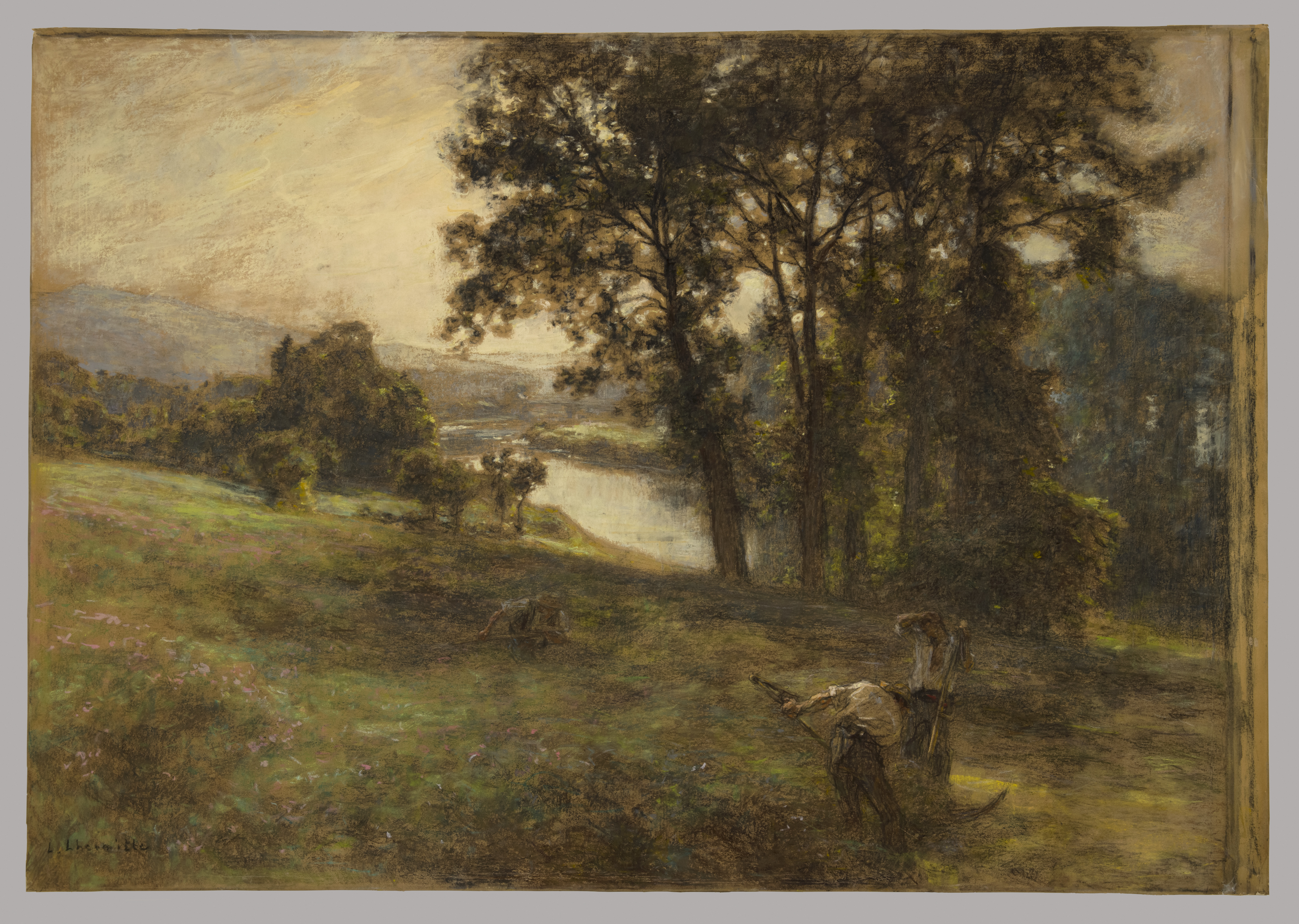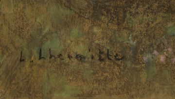 This work is a pastel version of an oil painting Lhermitte exhibited at the 1906 Salon. The artist was widely praised for his focus on the individuality of the workers he portrayed. At this point in his career, he had begun to acknowledge Impressionist techniques in his work, including his use of pastel as a medium. The shift is apparent in the focus on landscape rather than figures, on the atmospheric conditions, and the splash of color in the flowers on the left.