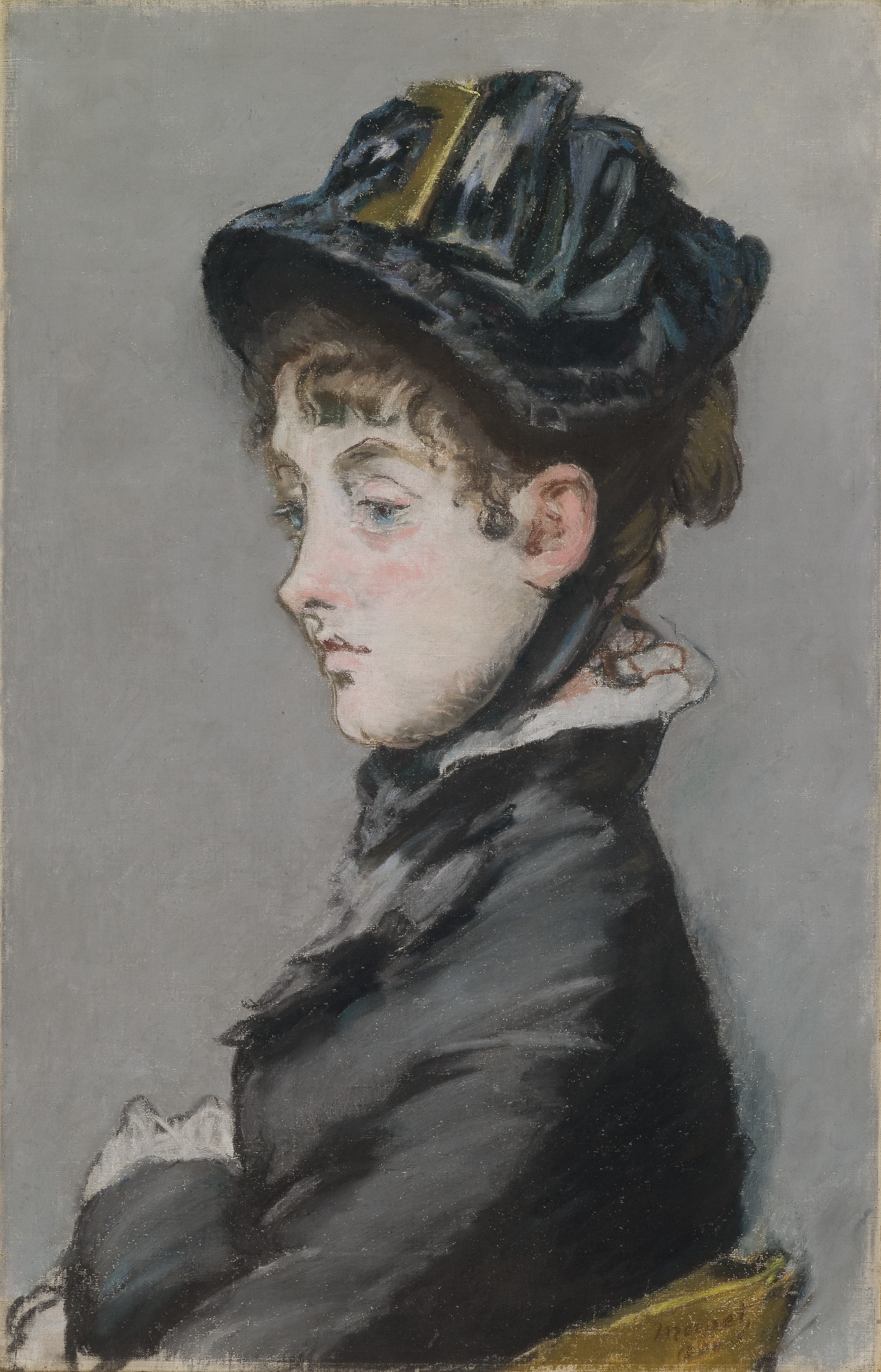 Édouard Manet’s portrait depicts the fashionable Madame Jules Guillemet, a close friend and frequent model, wearing a beribboned black bonnet and high-necked black jacket. Manet paid careful attention to the materials of the hat, rendering the folds of the ribbon in blue and green, and highlighting the sheen of the material. The ribbon is held in place by a large gold buckle, popular in similarly styled bonnets from the 1880s.