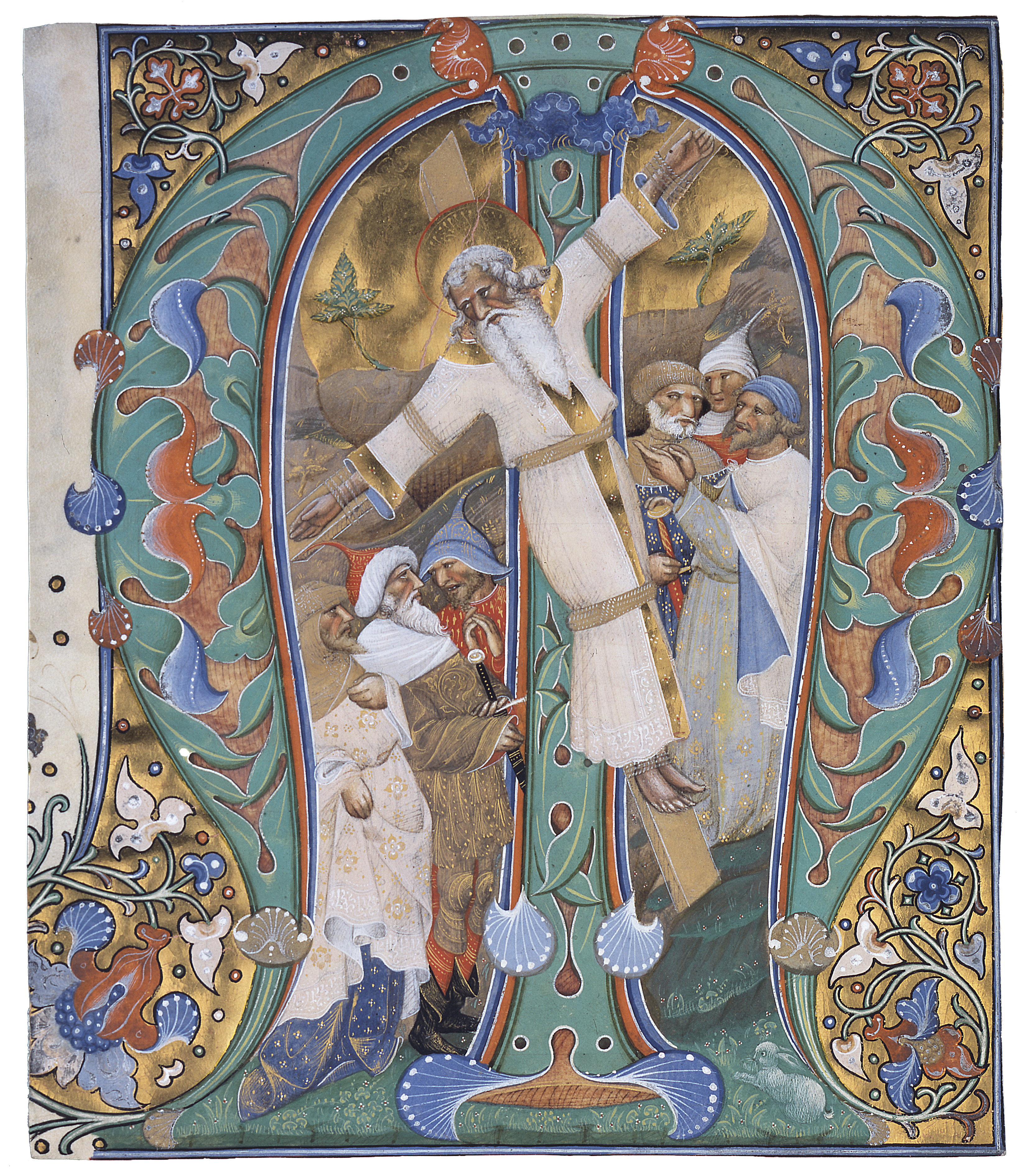 This richly decorated image of the crucifixion of St. Andrew is one of the masterworks of fifteenth-century Venetian manuscript illumination. The artist utilized intricate drapery patterns, memorable color combinations, and inventive ornamentation. Here he made especially clever use of the first letter of the introductory chant for the feast day of St. Andrew. The oversized M both anchors his composition and stabilizes the angled arm of the cross. After the tenth century, artists often illustrated Andrew's martyrdom with an X-shaped cross. Here, the artist playfully challenged the separation of image and frame by having the soldier immediately to the left of the central shaft of the M insert his sword between the letter and its foliate decoration, perhaps a reference to Andrew's followers, who attempted to cut him down from the cross.