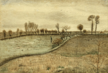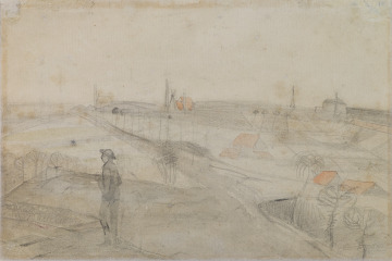 Vincent van Gogh drew on both sides of this sheet of paper. Each shows a figure walking through a landscape. The larger figure inhabits the immediate outskirts of an industrial town, while the smaller one is fully immersed in the fields. These two adjacent drawings show the young artist teaching himself to draw, and both point to significant aspects of van Gogh’s outlook on life.
