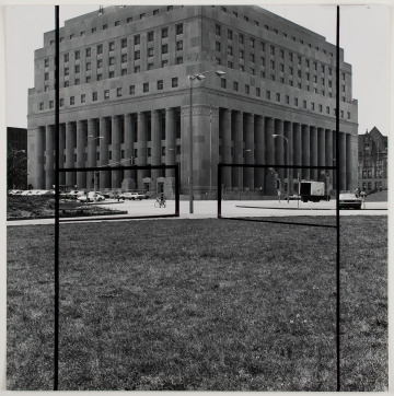 Manipulated Photograph related to “Twain”, view from outside the sculpture looking through to the Southwest toward the United States Court House and Customs House