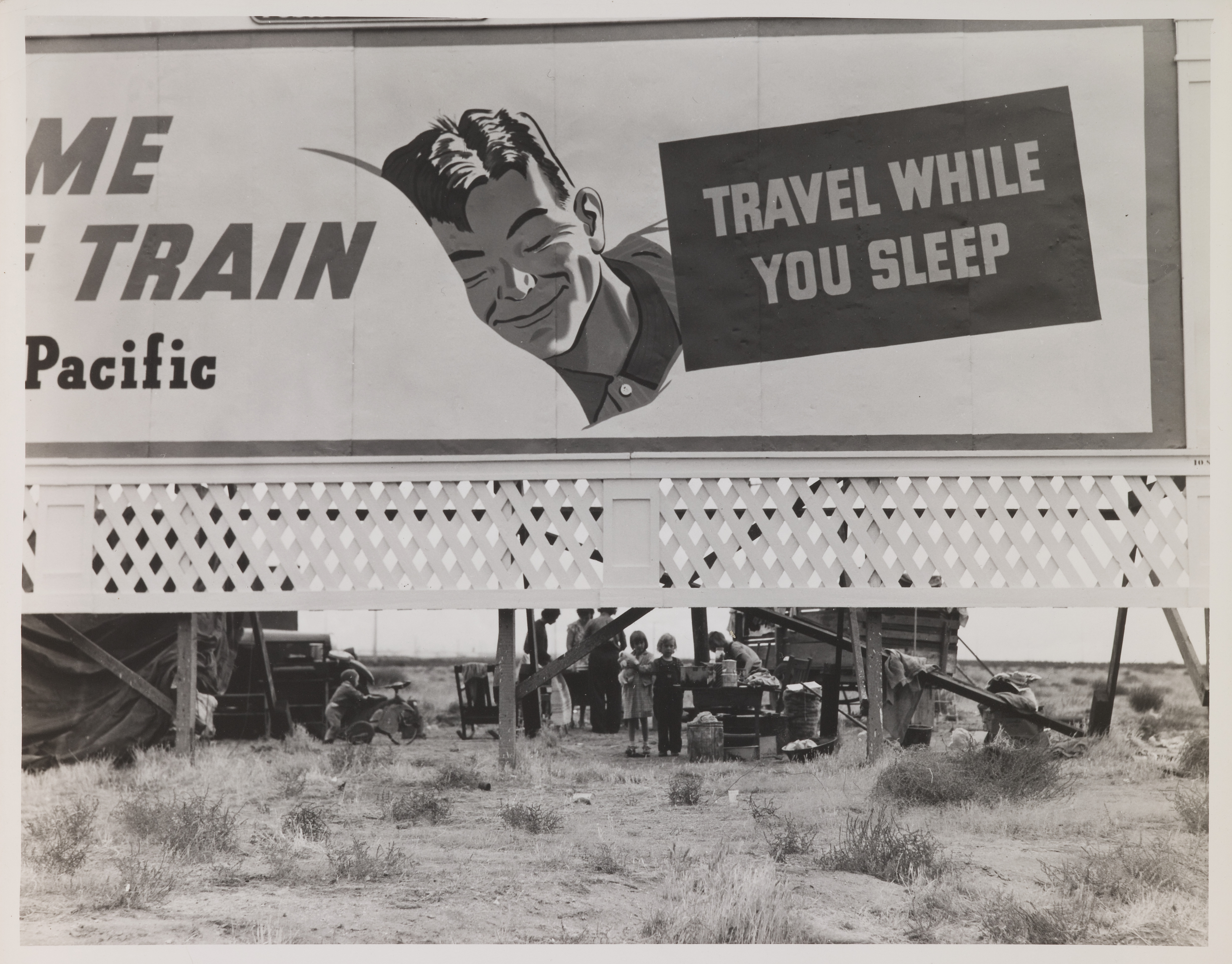 In this image, a billboard advertises luxurious train travel above a group of families camping outside near their cars. Dorothea Lange took this photograph on a road trip in her home state of California, where she documented the struggle of migrant workers. The visual dominance of the sign hovering over the figures suggests the growing wealth inequalities of the Great Depression. While some in this period had the financial means to seek adventure in their travel, others were forced to leave their homes because of economic struggles.