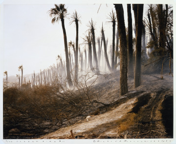 A tragic beauty pervades Richard Misrach's photograph of the aftermath of a desert fire in the American Southwest. Several rows of charred palm trees in a smoky haze provide silent testimony to the recent destruction. As the fire that caused this blight was man-made, this photograph serves as an implicit critique of man's exploitation and mistreatment of the land. Instead of paradise, we are left to contemplate a scarred ecosystem. Misrach's images derive a unique power from their tension between visual seductiveness and disturbing subject matter.