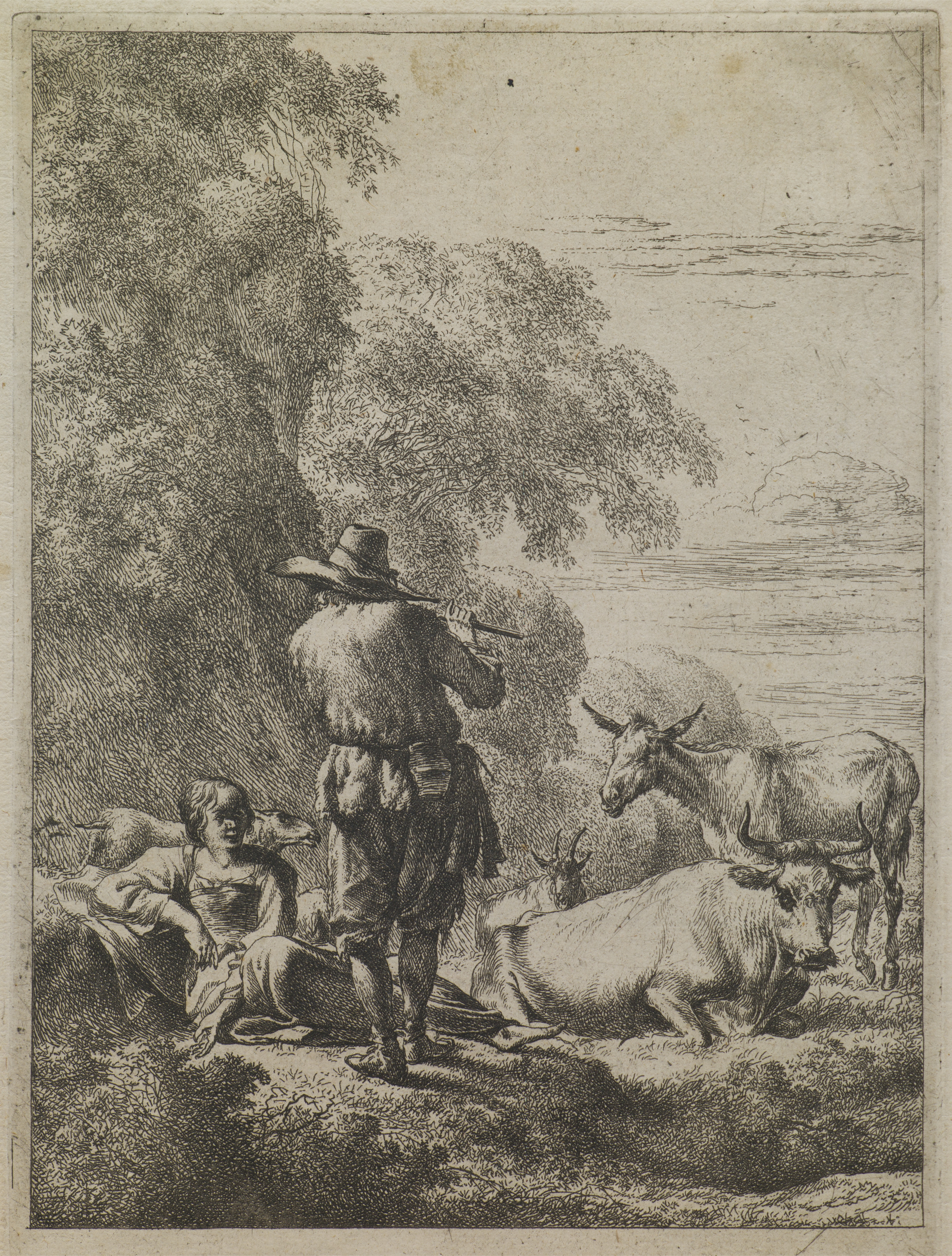 Bathed in the light of the late‑afternoon sun, a herdsman rests his flock at the edge of a hillside brook. Playing a wooden flute, he serenades his companion as she gazes adoringly at him. The Dutch artist Nicolaes Berchem specialized in such bucolic scenes, inspired by Europe’s centuries‑long interest in pastoral literature. Since classical antiquity, writers had extolled the virtues of an idealized and timeless character: the humble, carefree shepherd, who lives in harmony with nature and remains uncorrupted by the commercial or political concerns of city‑dwellers.