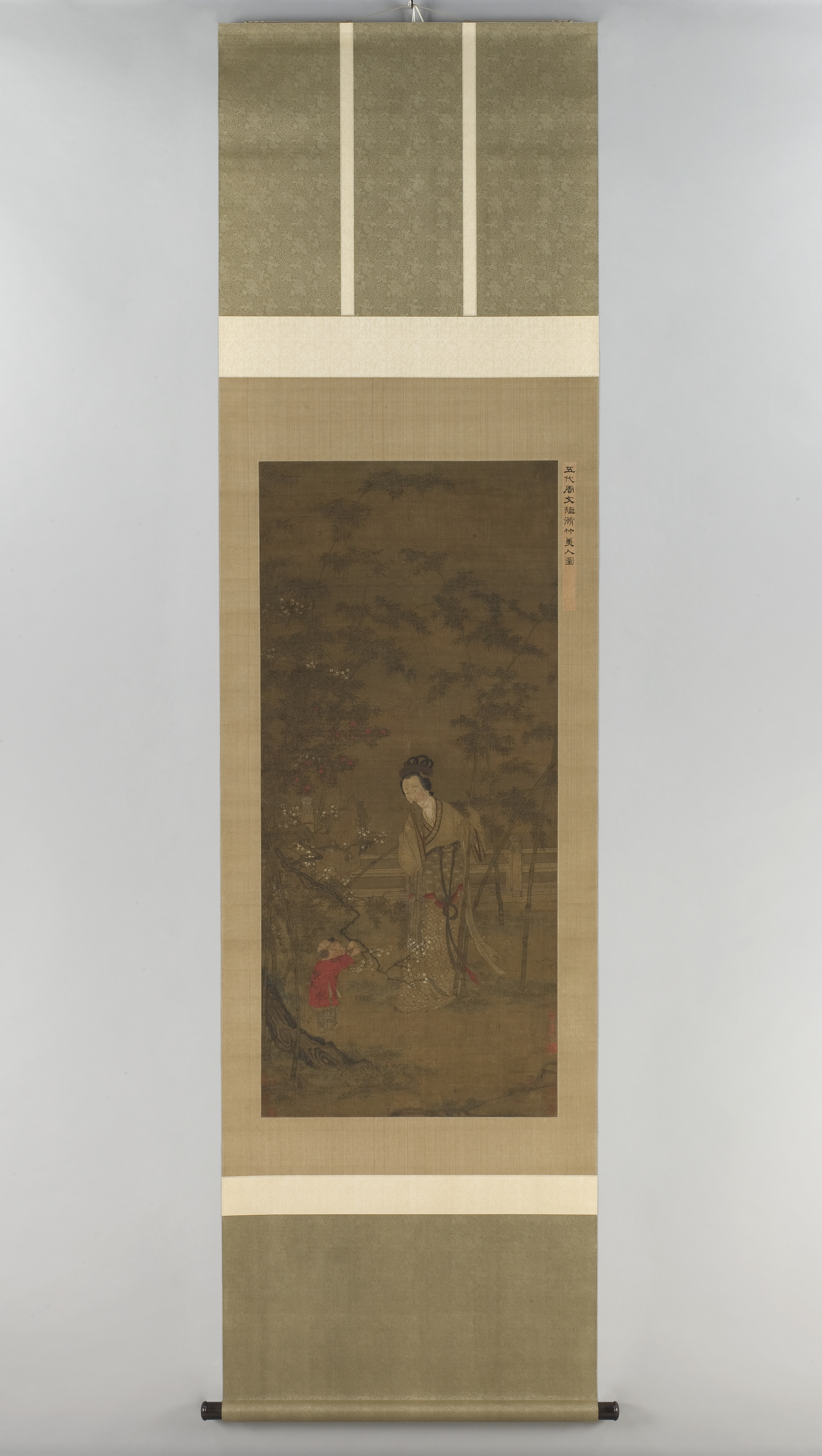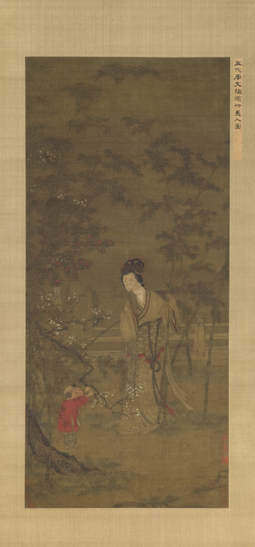 An elegantly robed woman at the center of this painting holds an upright stalk of bamboo. She gazes at a small child, who grasps a low-hanging branch of blossoming prunus with both hands. This early spring scene, set in a balustraded garden, also includes a tall rock with perforations and a camellia shrub, whose auspicious red flowers reflect joy and protection. The plants, flowers, and festive dress suggest the occasion to be Chinese New Year.